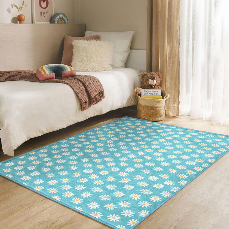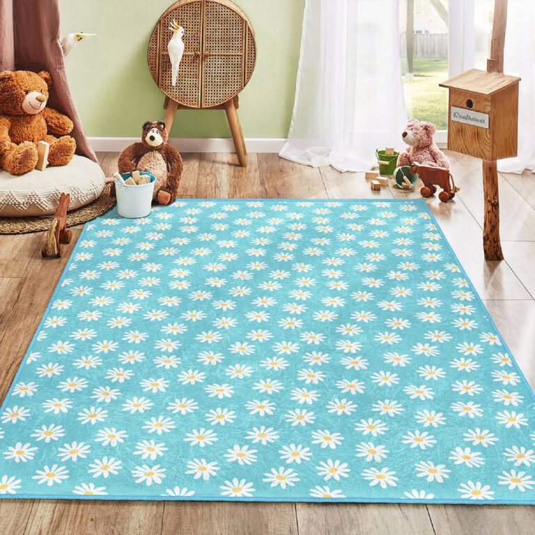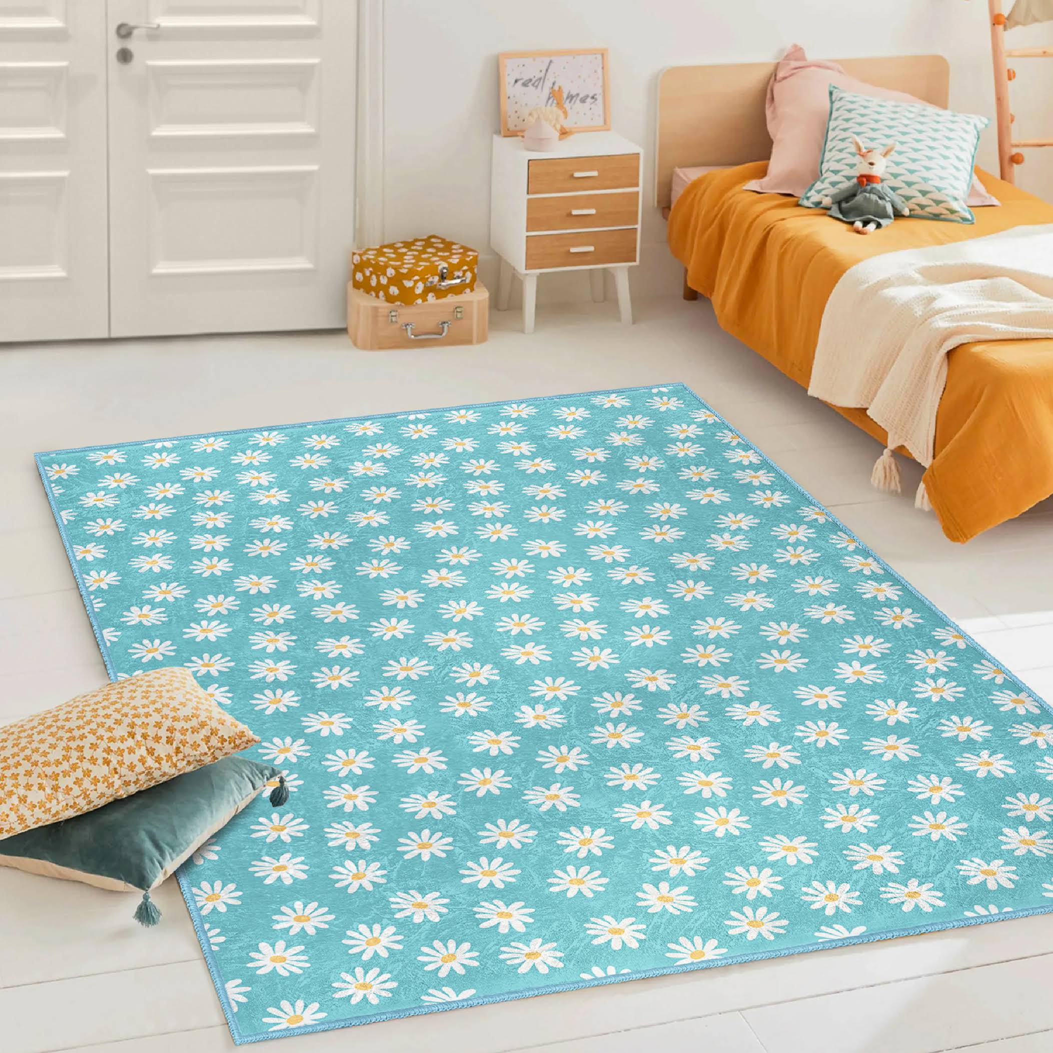 Beyaz Çiçek Desenli Renkli Eğlenceli Çocuk Halısı – Makinede Yıkanabilir Kaymaz Tabanlı