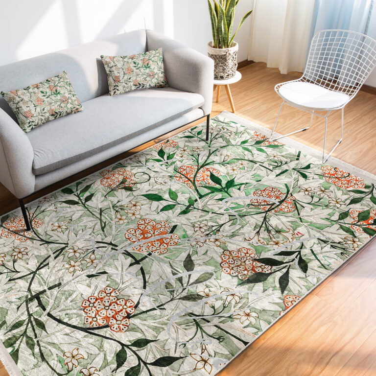 Beyaz Çiçeklerle Donatılmış Sade Desenli Salon & Oturma Odası Yıkanabilir Kaymaz Taban Halı