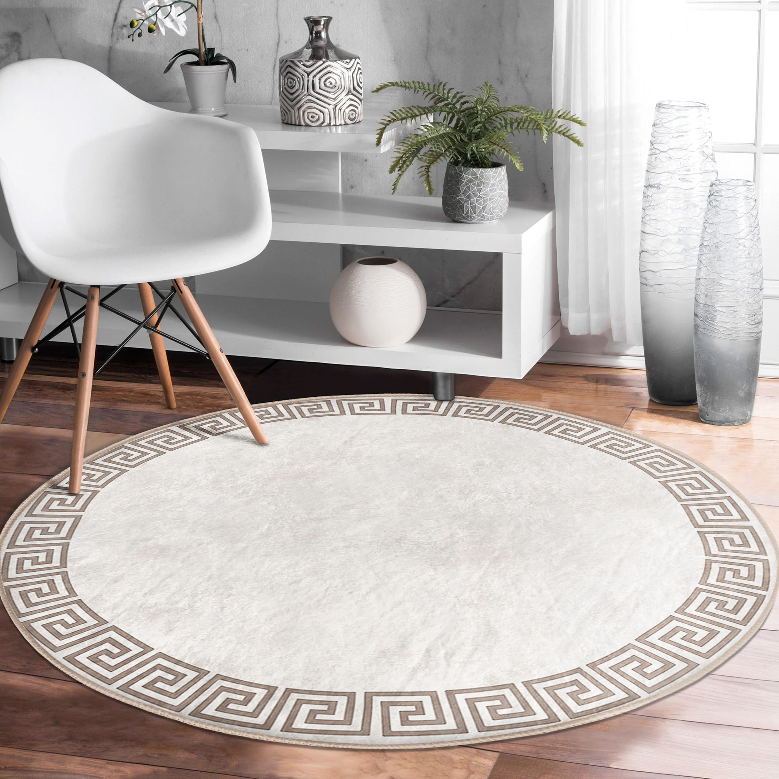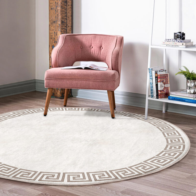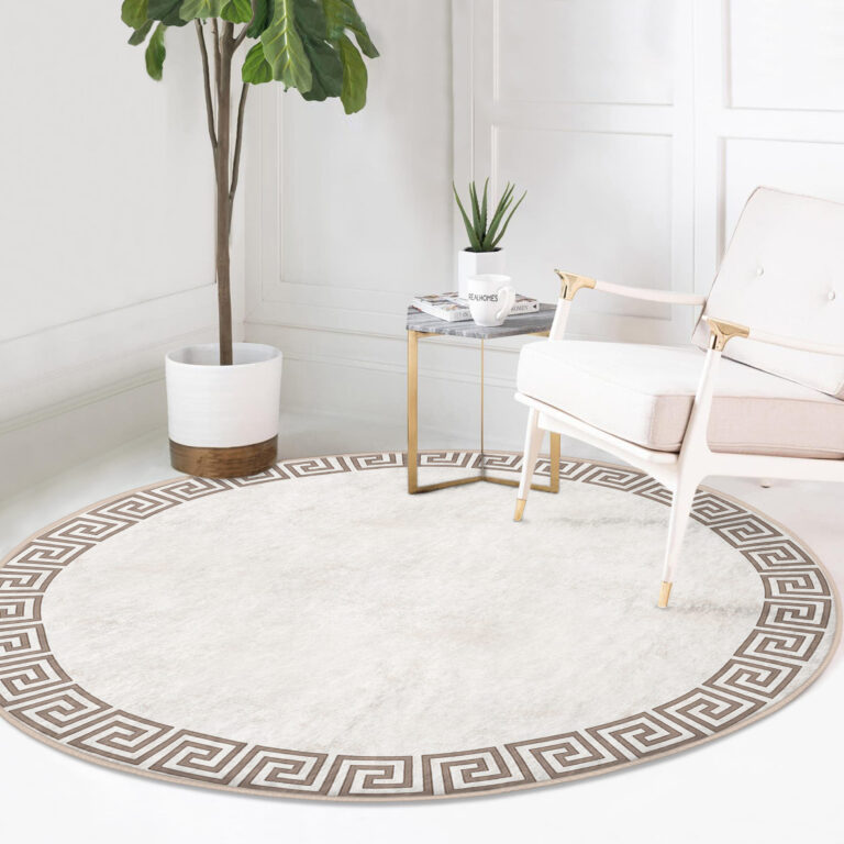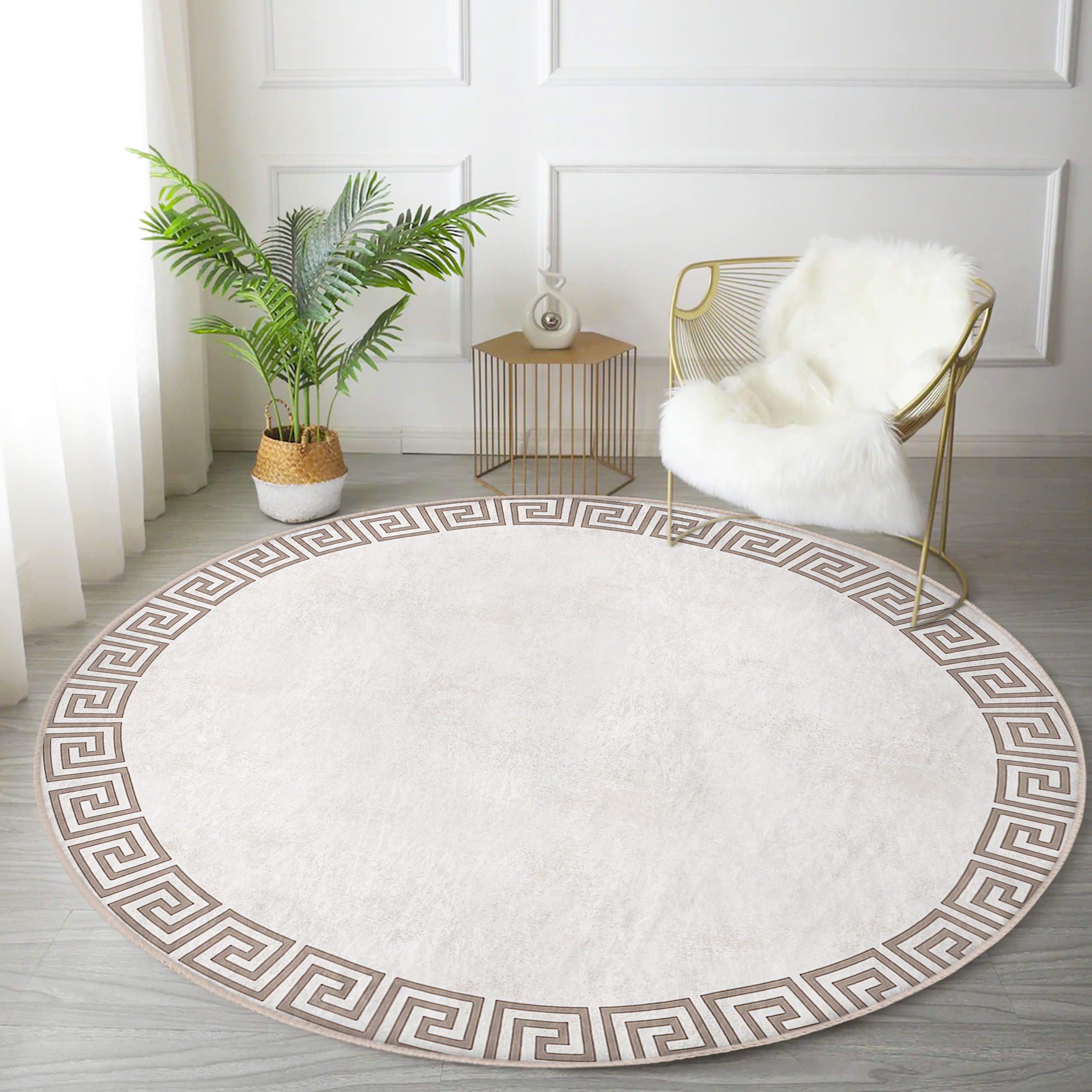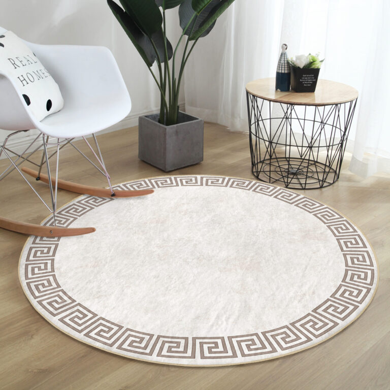 Beyaz – Kahverengi Geometrik Motifli Şık Tasarıma Sahip Yuvarlak Salon Halısı – Makinede Yıkanabilir Kaymaz Tabanlı