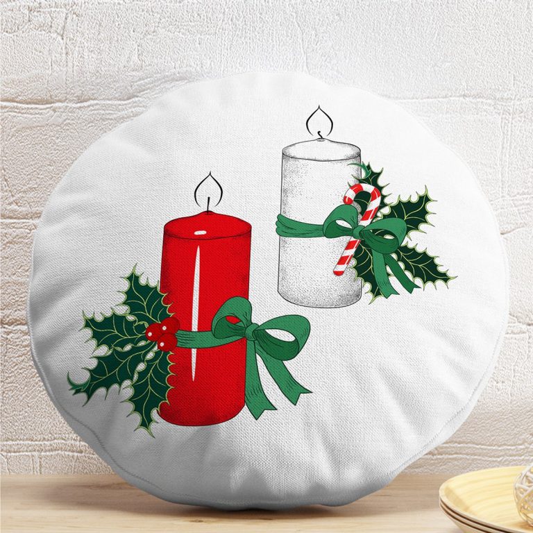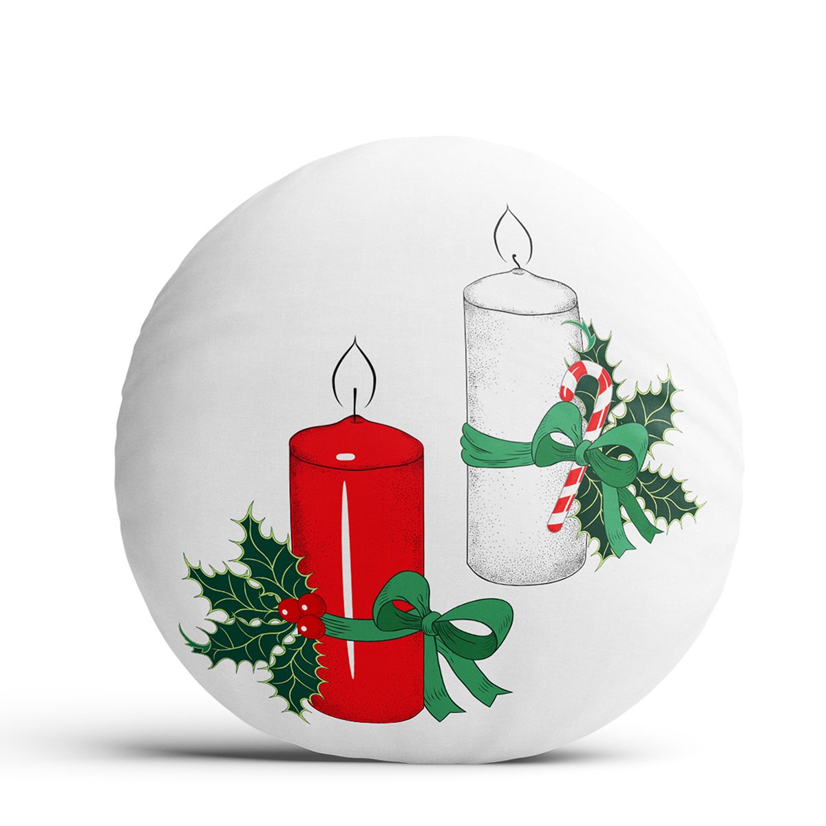 Beyaz & Kırmızı Kurdeleli Mum Motifli Dijital Baskılı Dekoratif Yuvarlak Yastık Kırlent Kılıfı