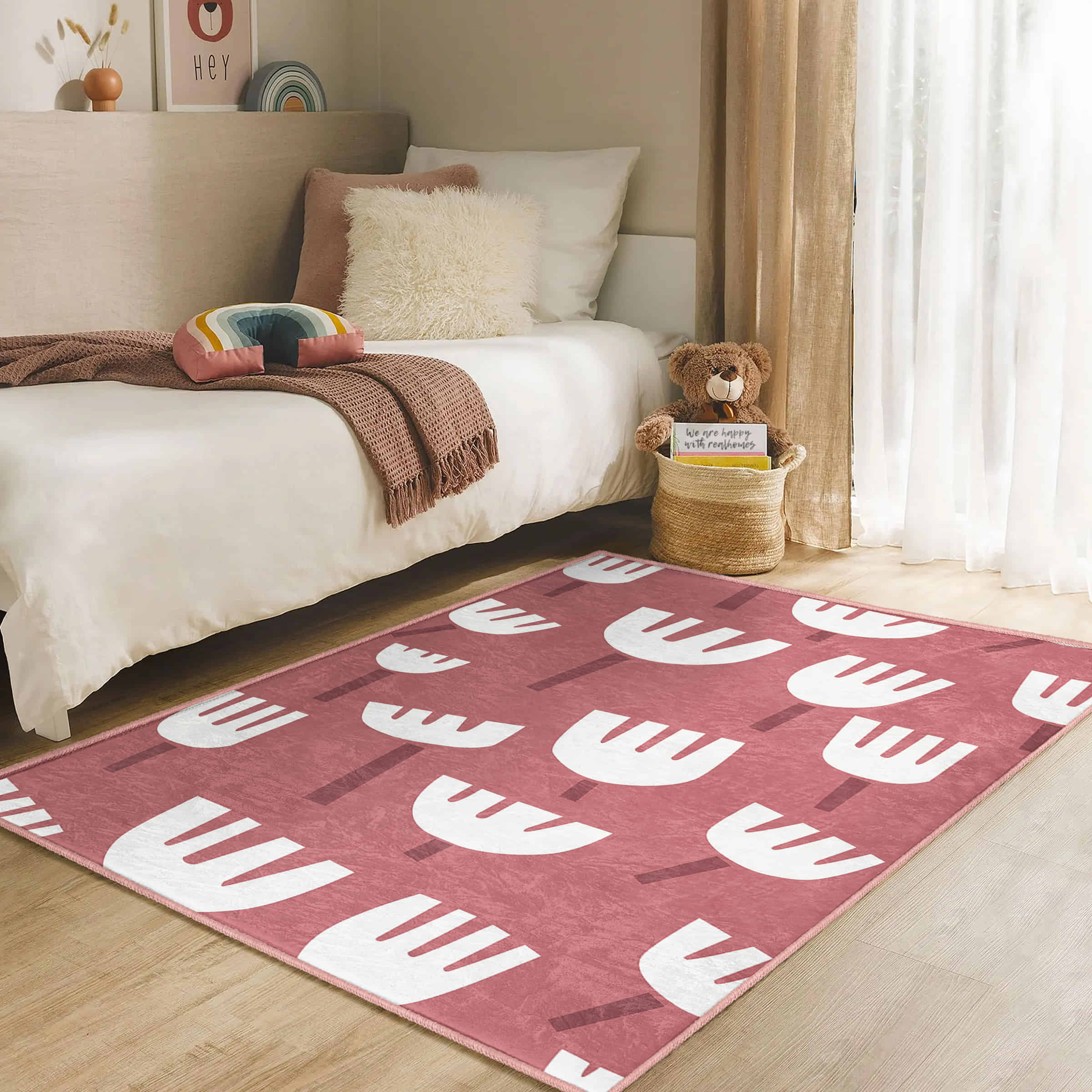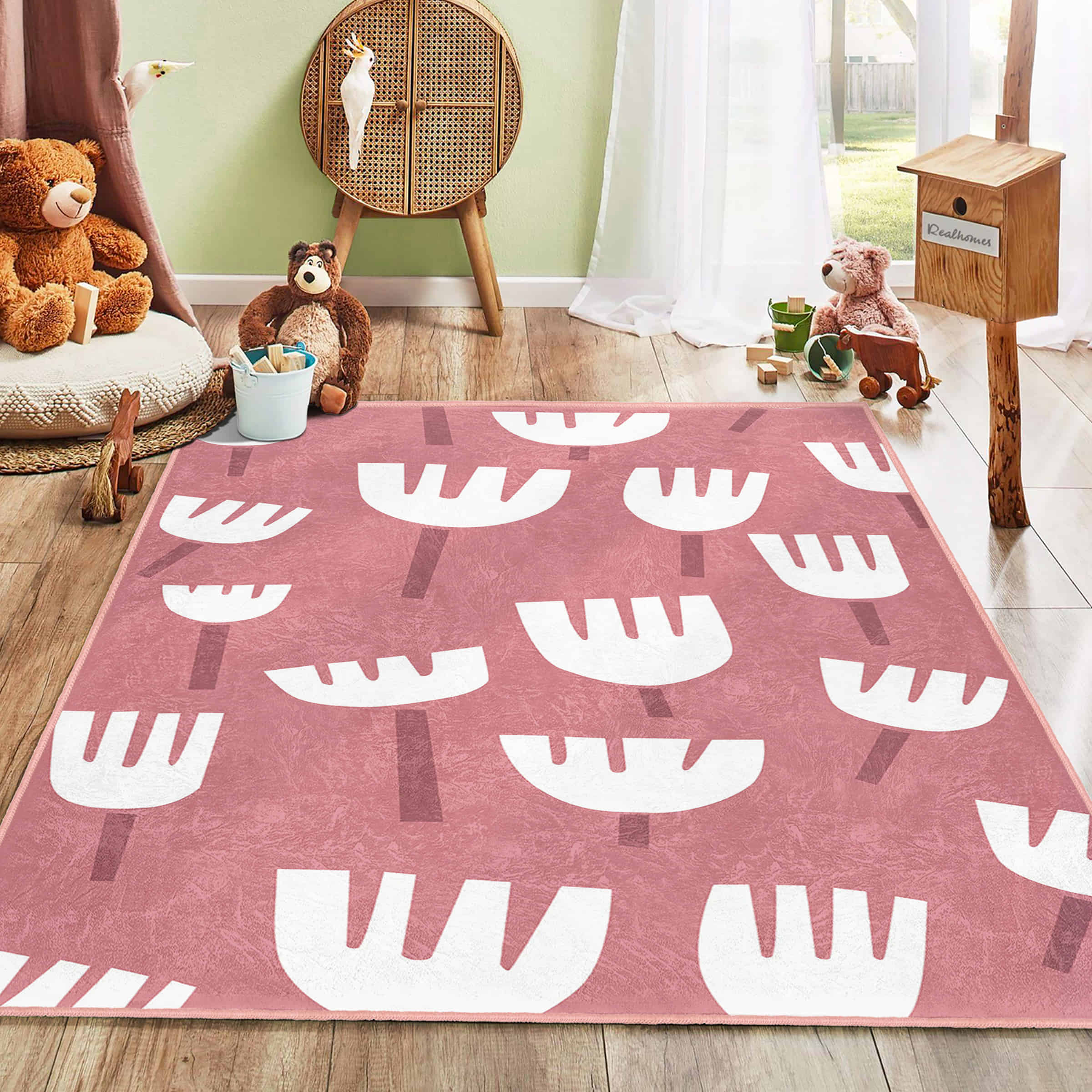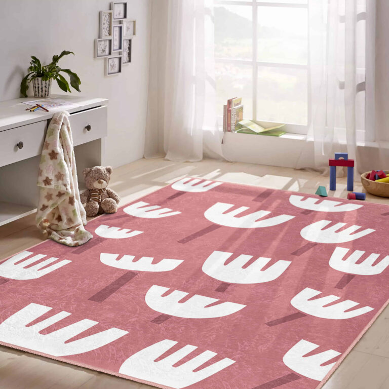 Beyaz Saplı Çiçek Motifli Renkli Çocuk Halısı – Kaymaz Tabanlı Makinede Yıkanabilir Dikdörtgen Halı