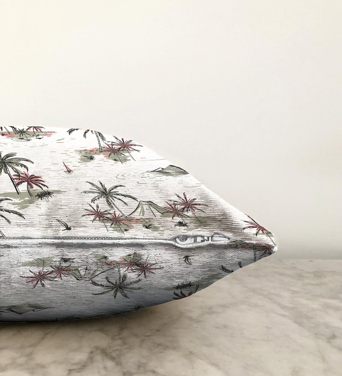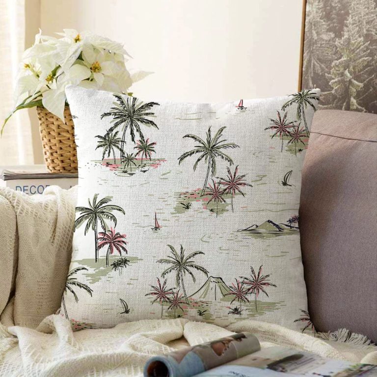 Beyaz Temalı Palmiye Adası Dijital Baskılı Raşel Yastık Kırlent Kılıfı