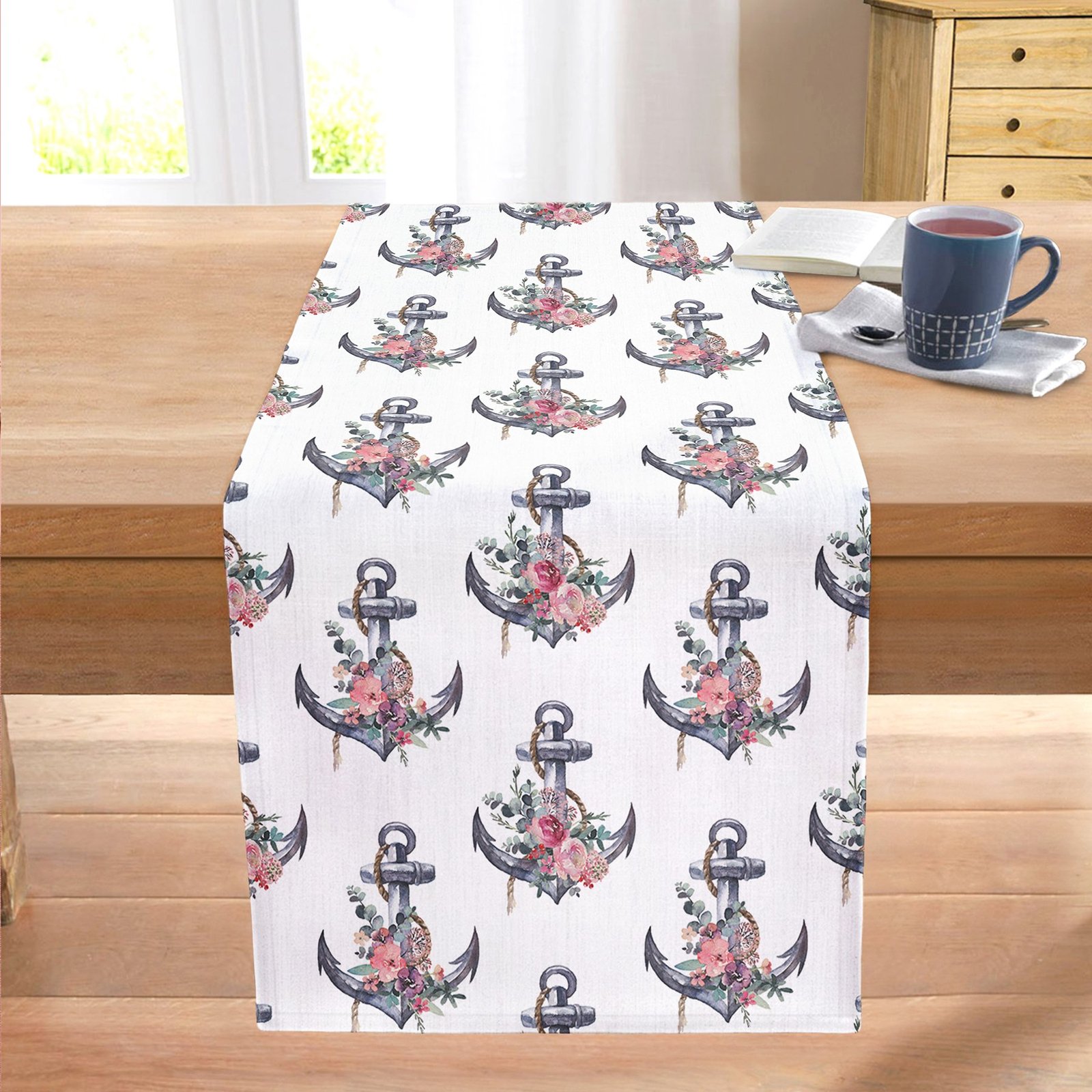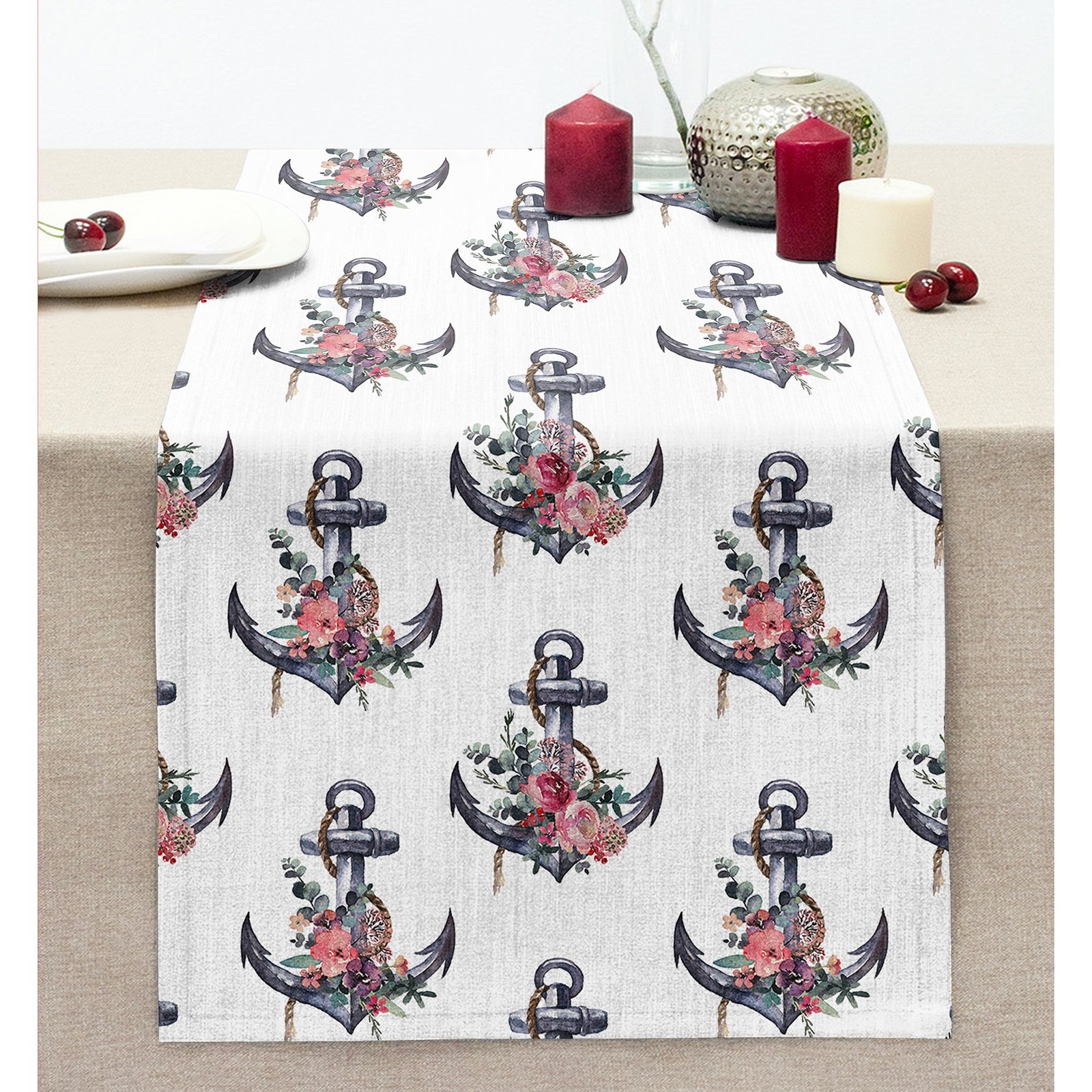 Beyaz Zemin Çapa Motifli Dijital Baskılı Modern Dikişli Şönil Runner