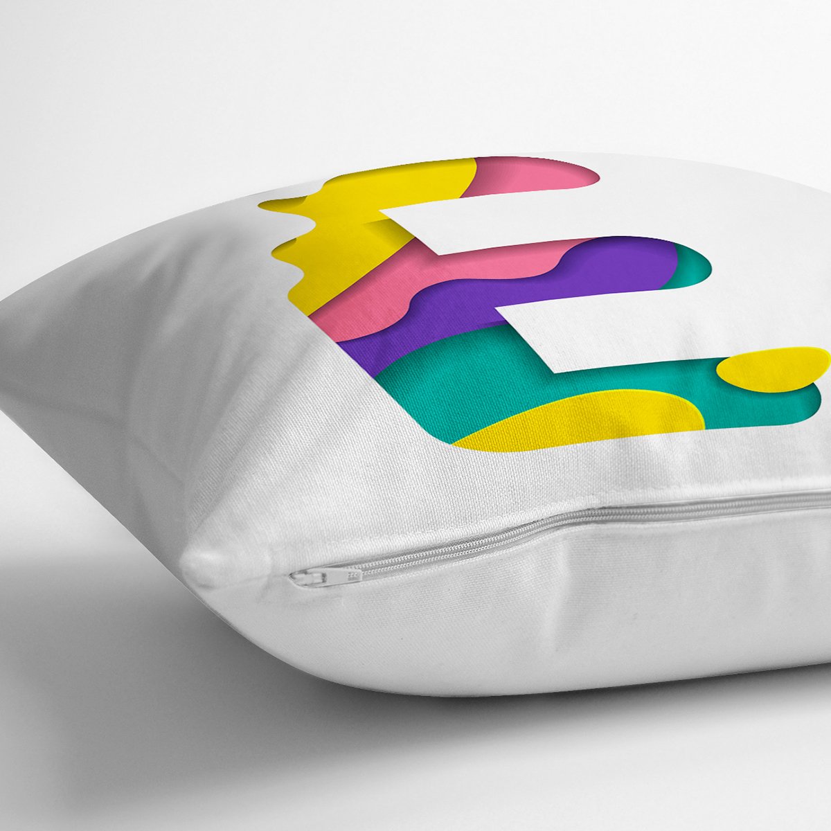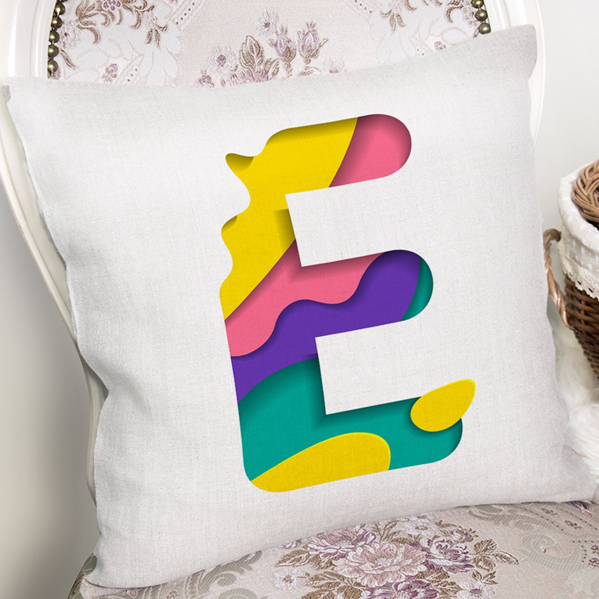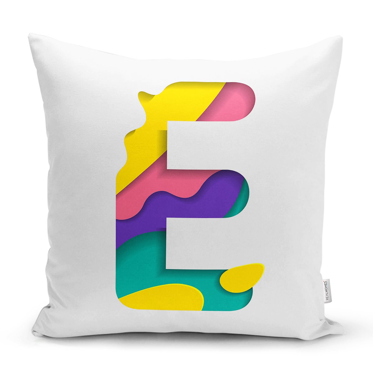 Beyaz Zemin Renkli E Harfli Özel Tasarım Dijital Baskılı Yastık Kırlent Kılıfı