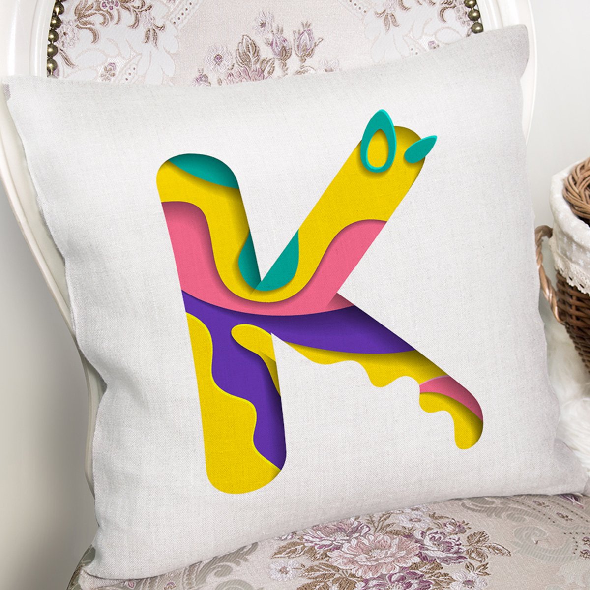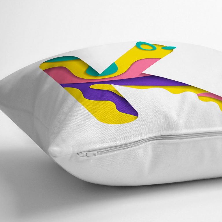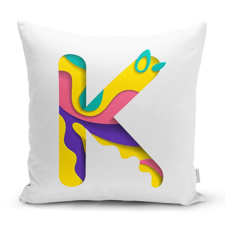 Beyaz Zemin Renkli K Harfli Özel Tasarım Dijital Baskılı Yastık Kırlent Kılıfı