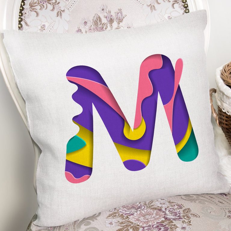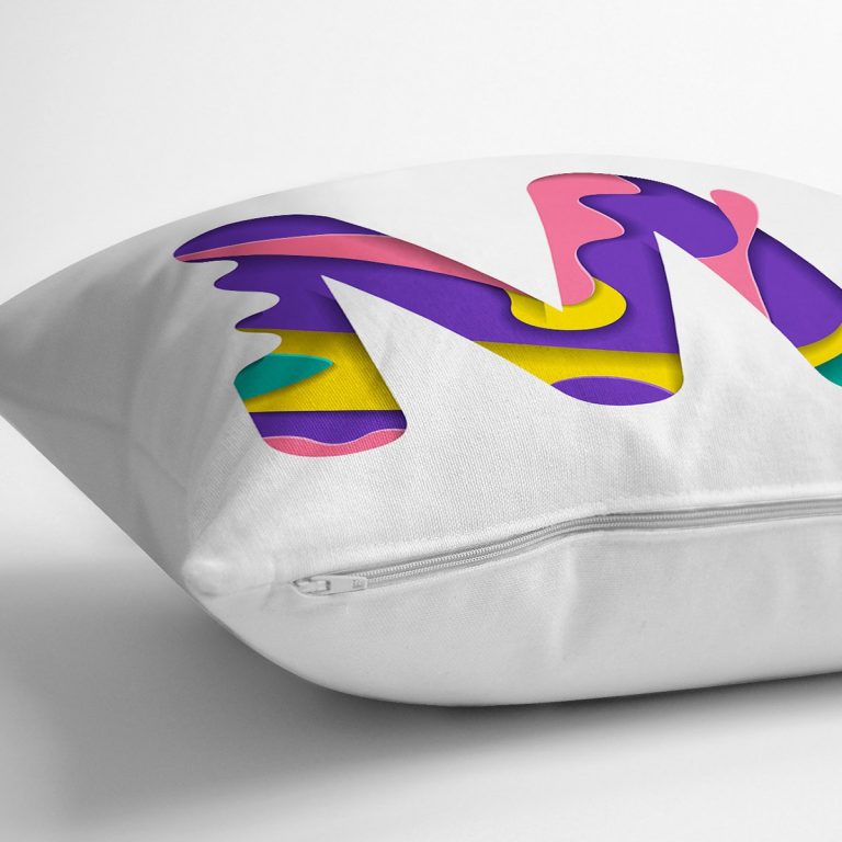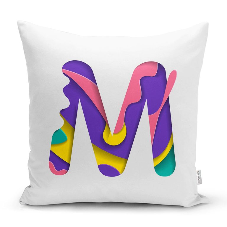 Beyaz Zemin Renkli M Harfli Özel Tasarım Dijital Baskılı Yastık Kırlent Kılıfı