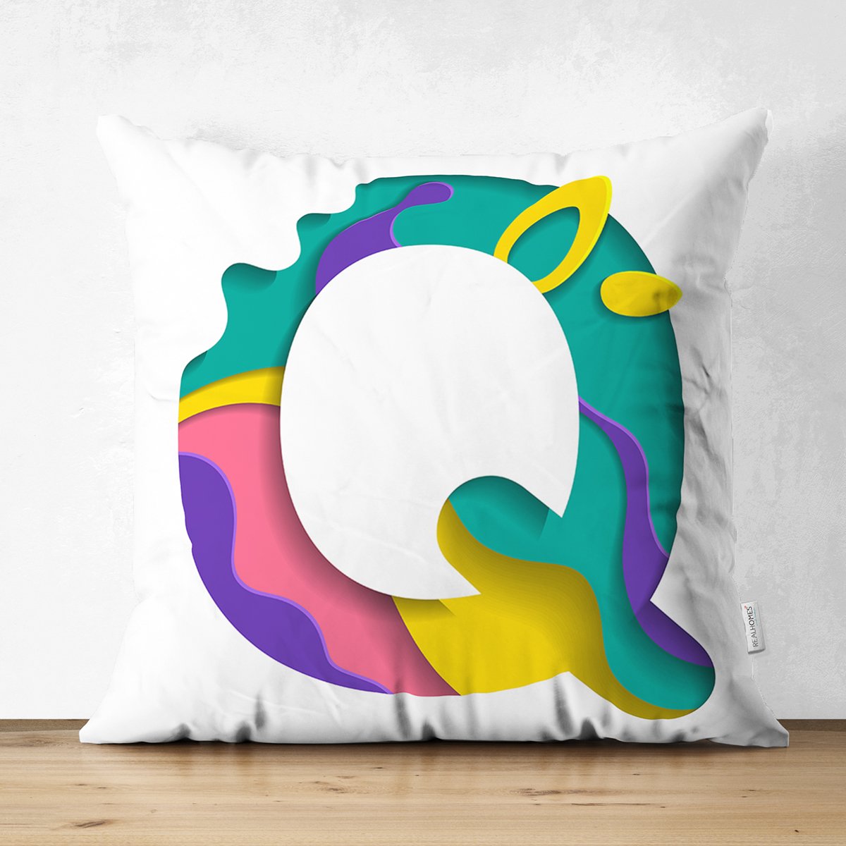 Beyaz Zemin Renkli Q Harfli Özel Tasarım Modern Suet Yastık Kırlent Kılıfı