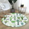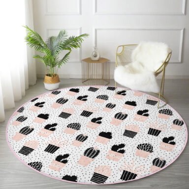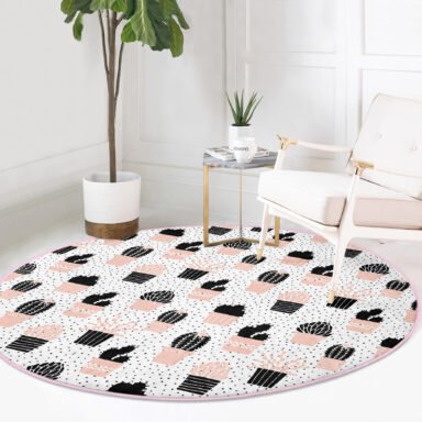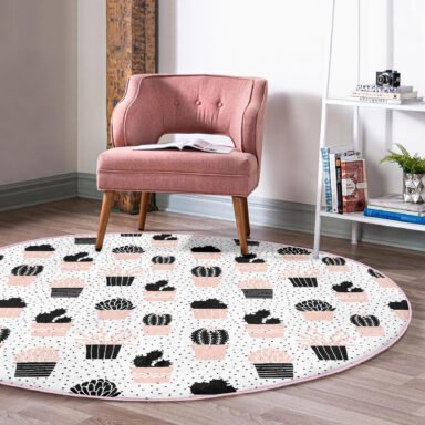 Beyaz Zemin Siyah Puantiyeli Kaktüs Desenli Koridor Ve Antre Yıkanabilir Kaymaz Taban Yuvarlak Halı