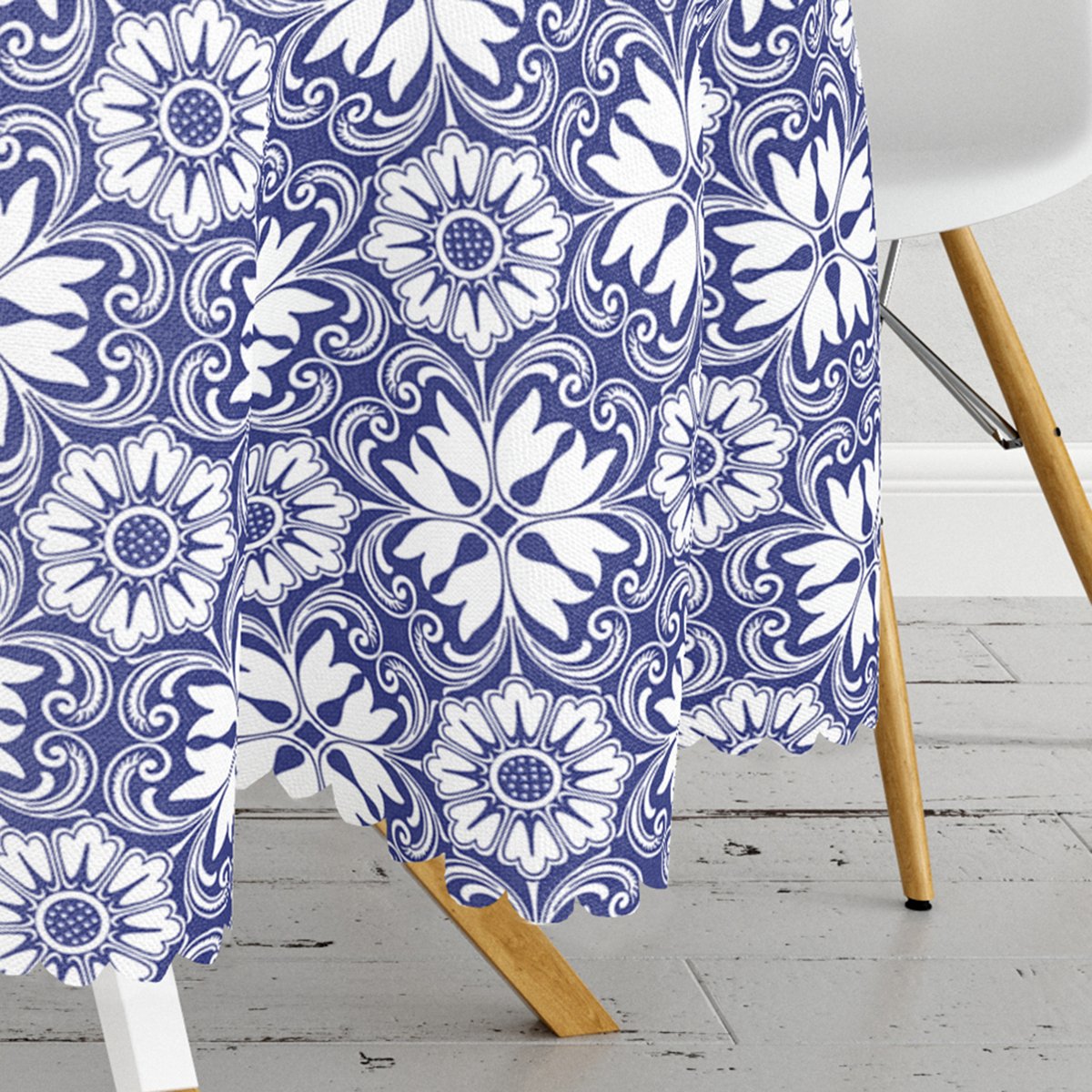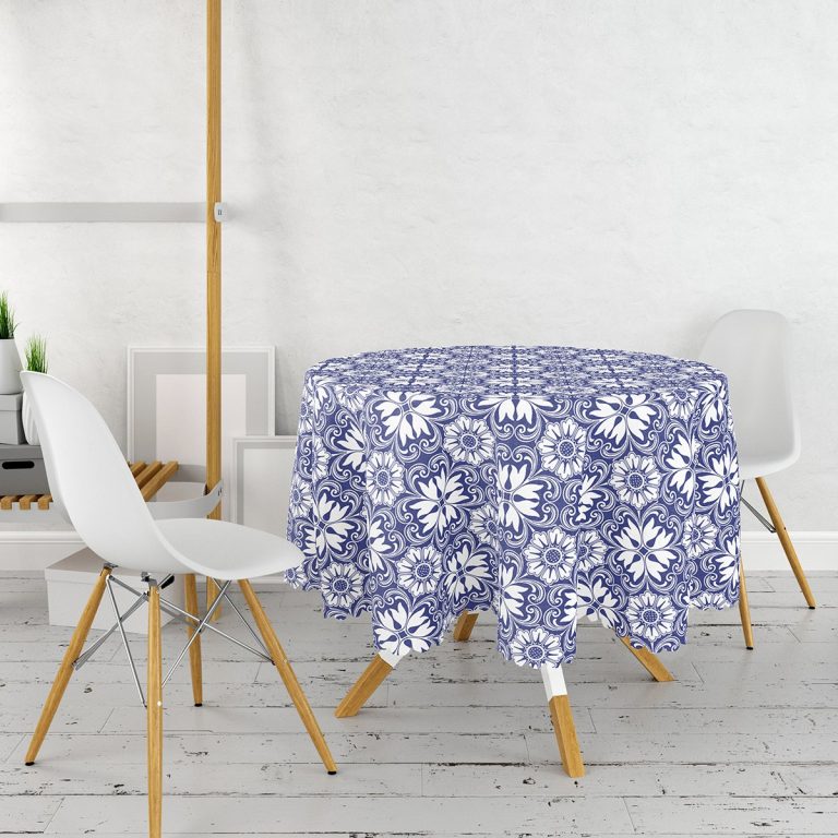 Beyaz Zemin Üzerinde Çini Desenli Dijital Baskılı Modern Yuvarlak Masa Örtüsü – Çap 140cm