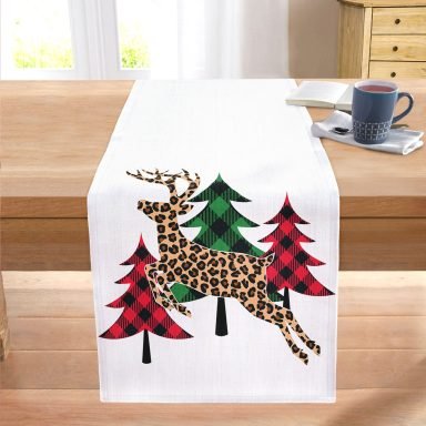 Beyaz Zemin Üzerinde Ekoseli Çam Ağacı Desenli Dijital Baskılı Modern Dikişli Şönil Runner