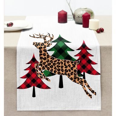 Beyaz Zemin Üzerinde Ekoseli Çam Ağacı Desenli Dijital Baskılı Modern Dikişli Şönil Runner