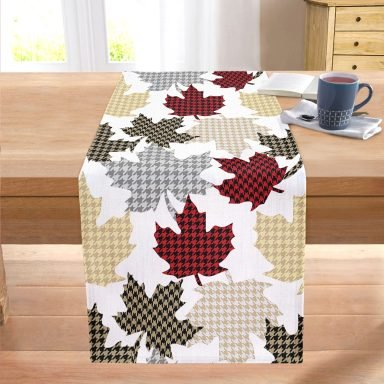 Beyaz Zemin Üzerinde Ekoseli Yaprak Desenli Dijital Baskılı Modern Dikişli Şönil Runner