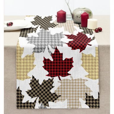 Beyaz Zemin Üzerinde Ekoseli Yaprak Desenli Dijital Baskılı Modern Dikişli Şönil Runner