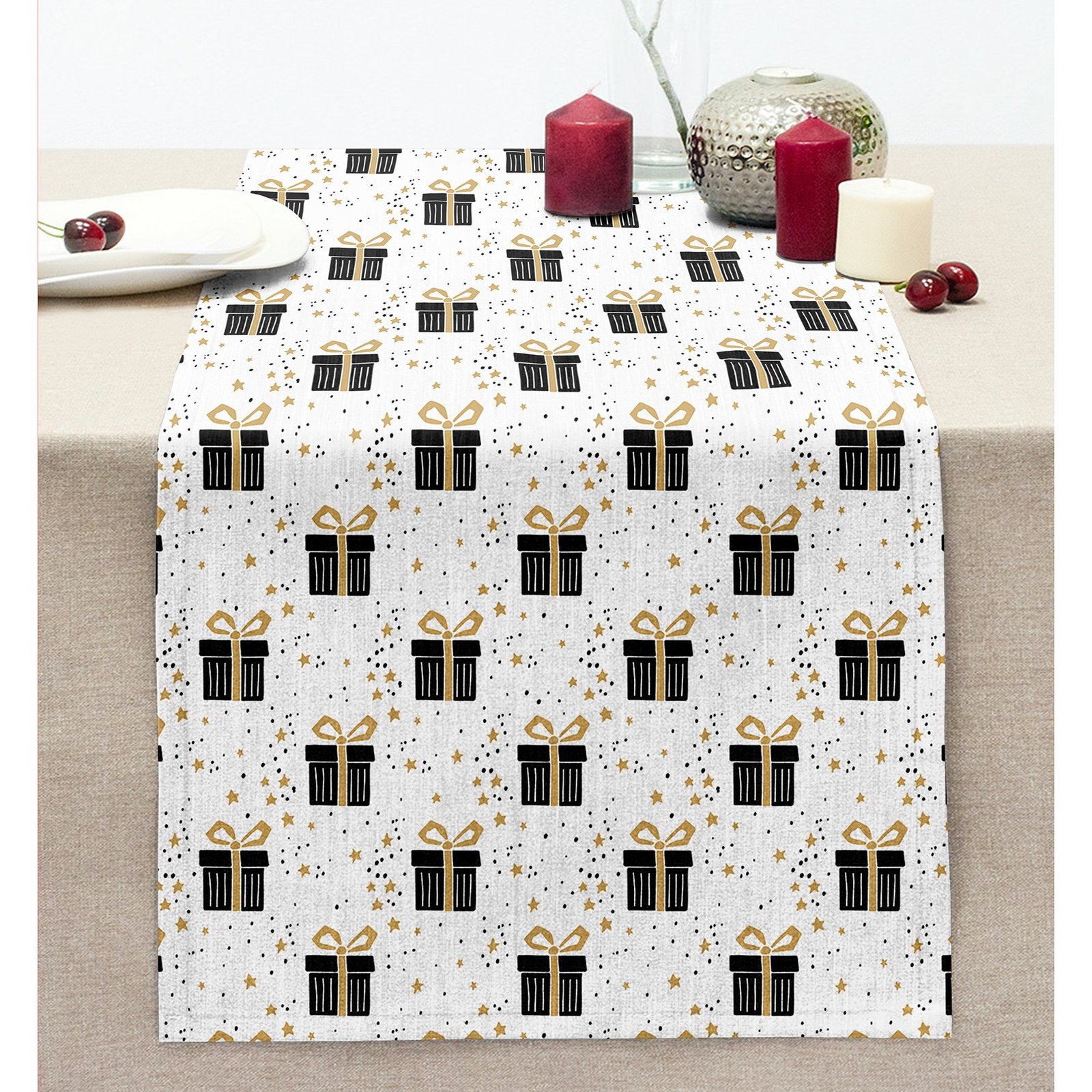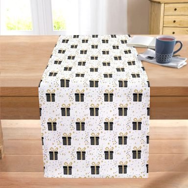 Beyaz Zemin Üzerinde Gold Detaylı Hediye Paketi Desenli Dijital Baskılı Modern Dikişli Şönil Runner