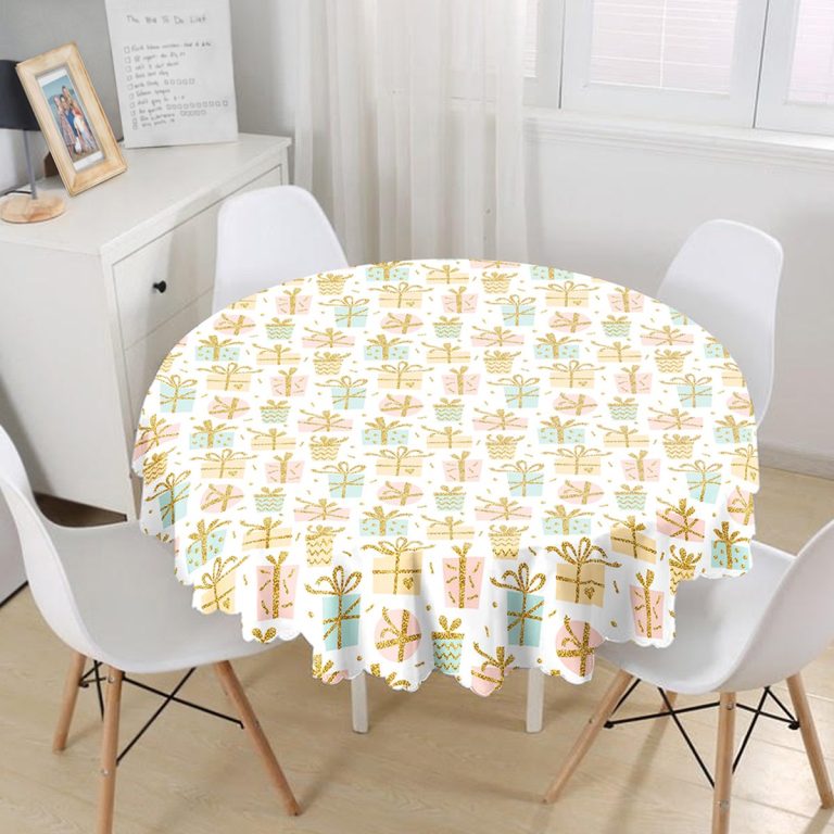 Beyaz Zemin Üzerinde Gold Detaylı Hediye Paketi Desenli Yuvarlak Masa Örtüsü – Çap 140cm