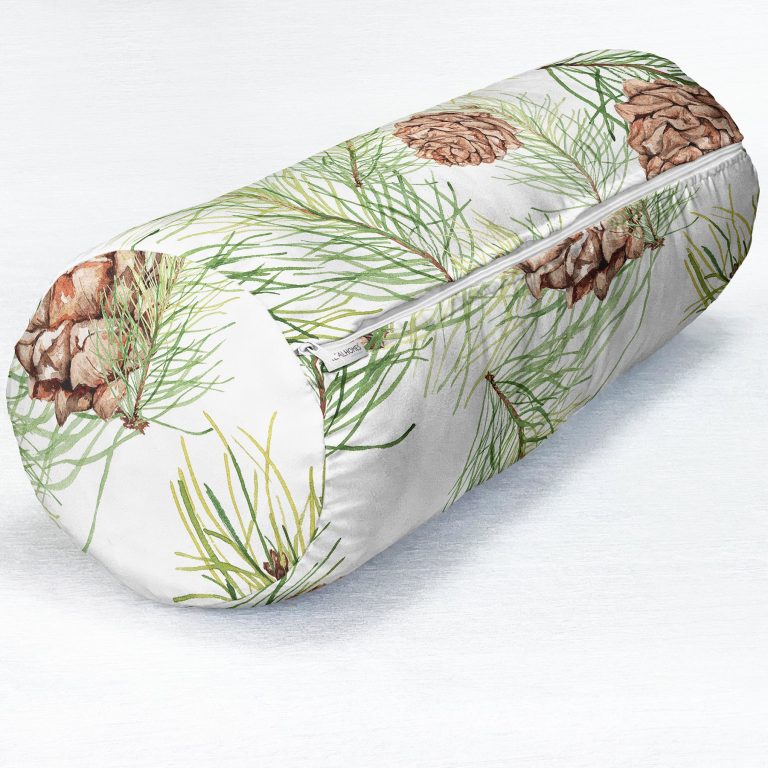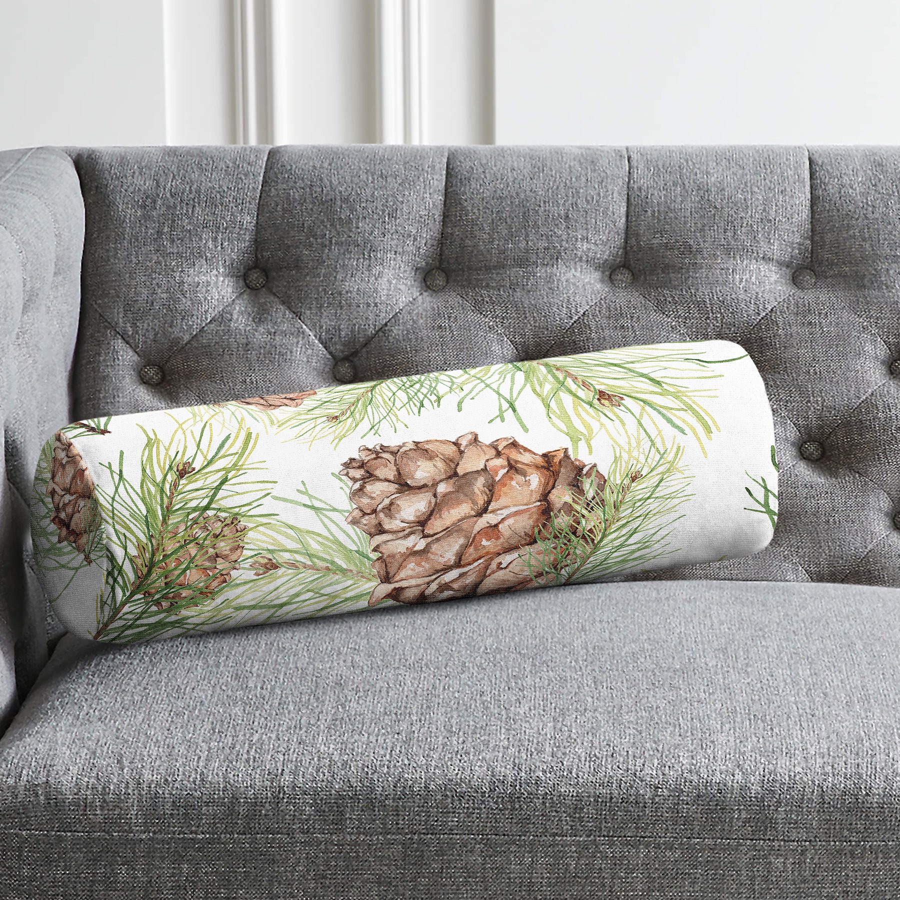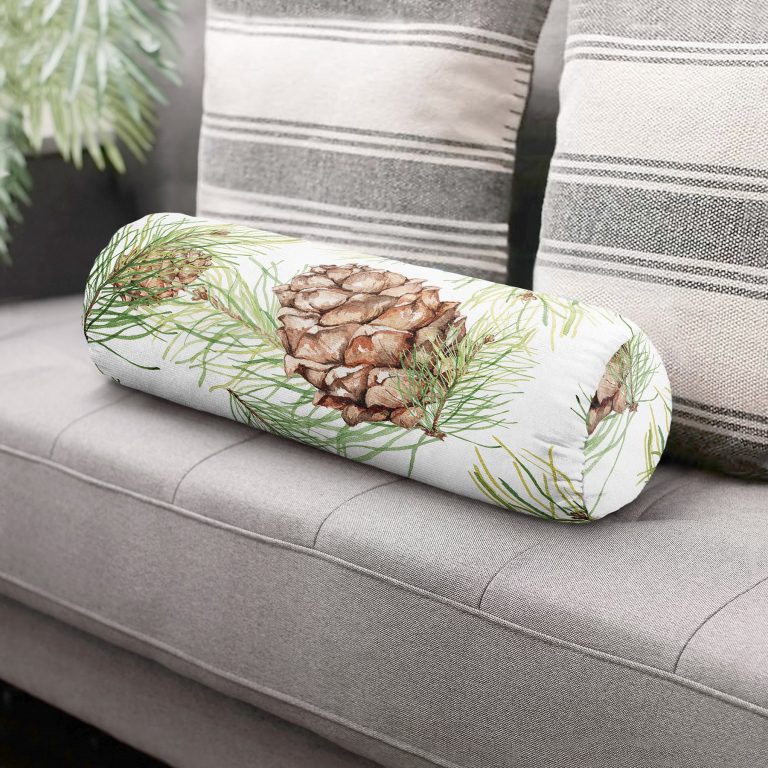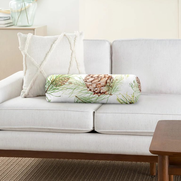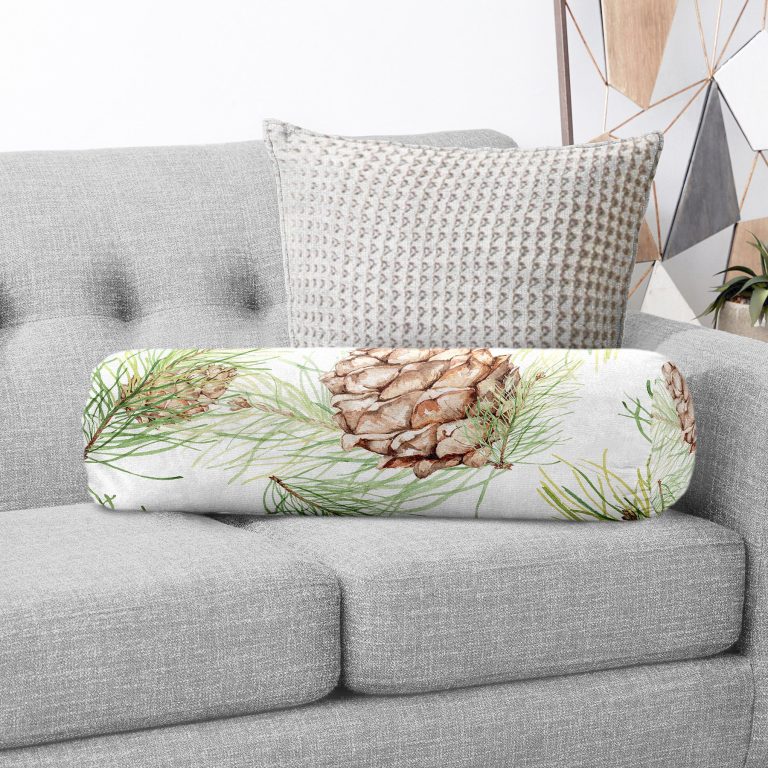 Beyaz Zemin Üzerinde İnce Yaprak Desenli Kozalak Dijital Baskılı Modern İç Dolgulu – Fermuarlı Süet Silindir Daire Yastık Kırlent