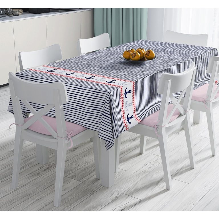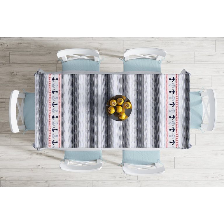 Beyaz Zemin Üzerinde Renkli Çizgili Çapa Desenli Dijital Baskılı Masa Örtüsü
