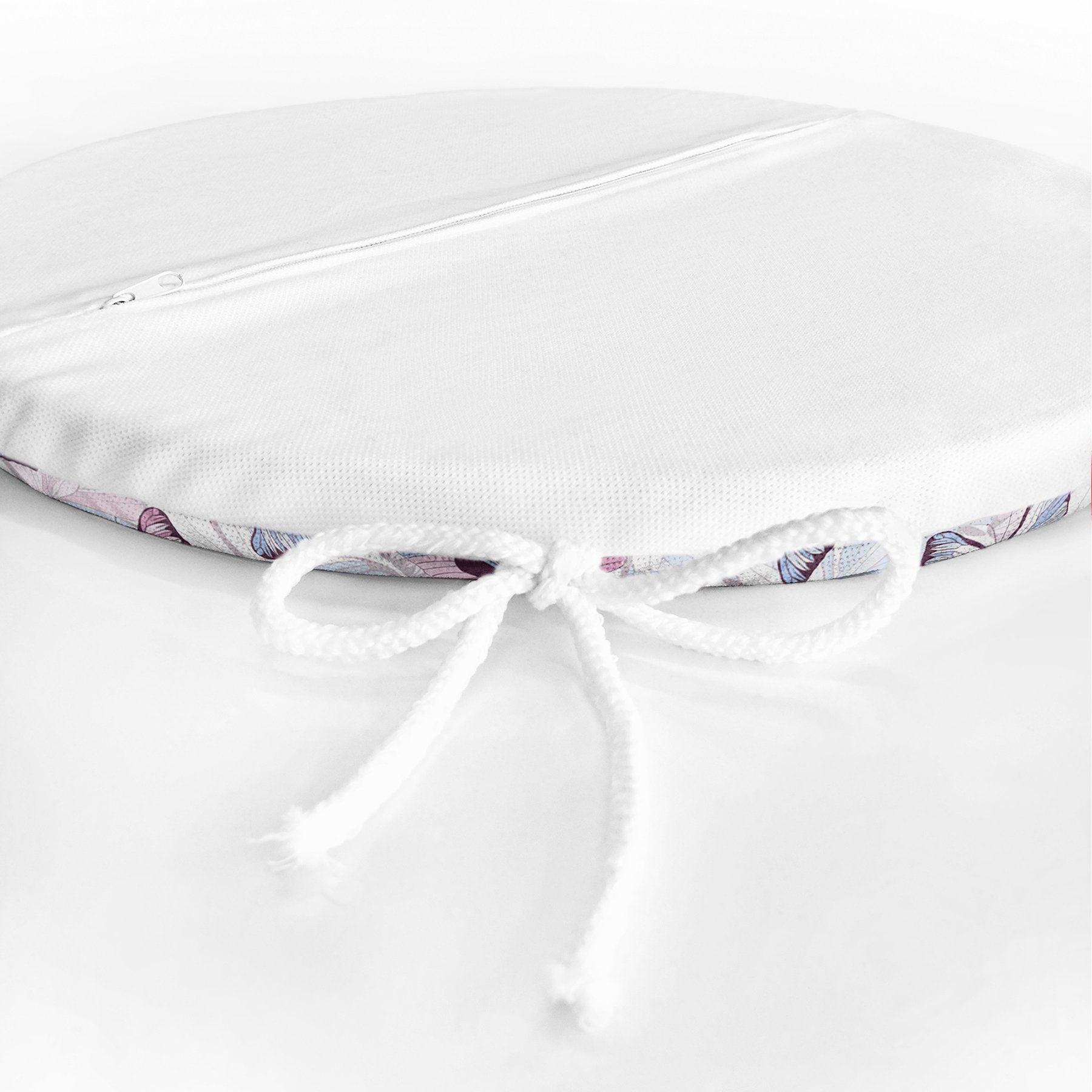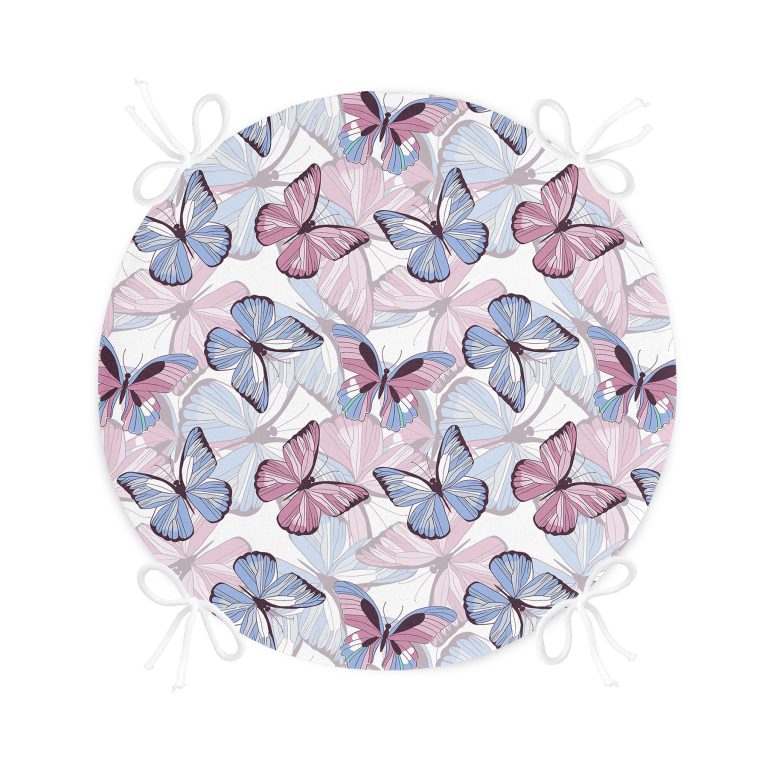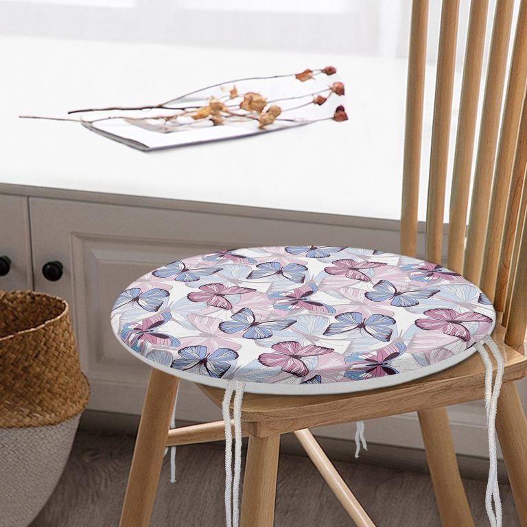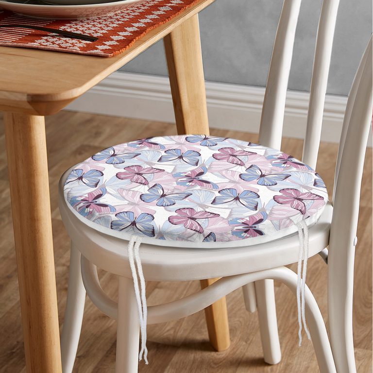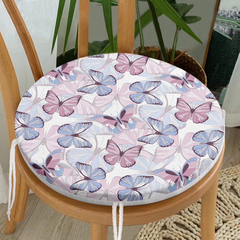 Beyaz Zemin Üzerinde Renkli Kelebek Desenli Dijital Baskılı Modern Yuvarlak Fermuarlı Sandalye Minderi