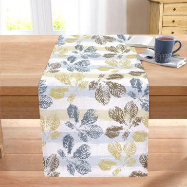 Beyaz Zemin Üzerinde Renkli Yaprak Desenli Dijital Baskılı Modern Dikişli Şönil Runner