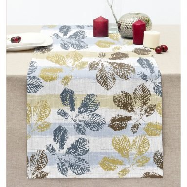 Beyaz Zemin Üzerinde Renkli Yaprak Desenli Dijital Baskılı Modern Dikişli Şönil Runner