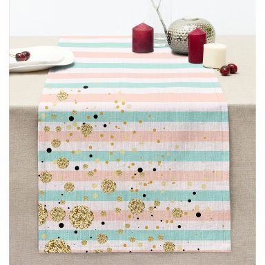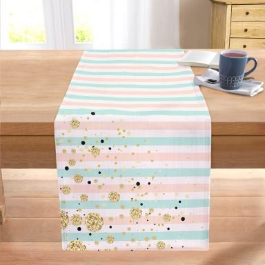 Beyaz Zemin Üzerinde Renkli Yatay Çizgili Gold Detaylı Dijital Baskılı Modern Dikişli Şönil Runner