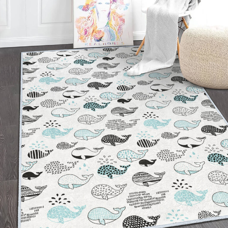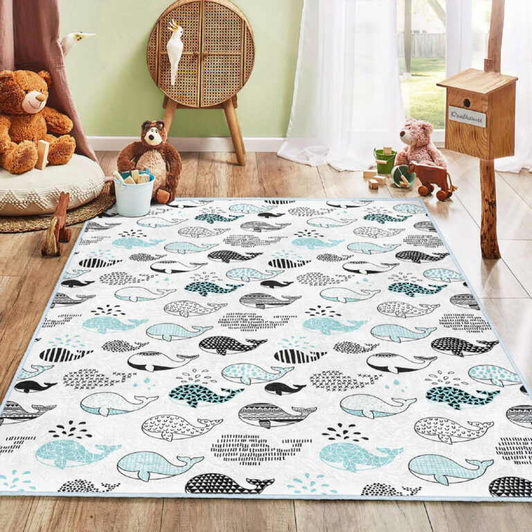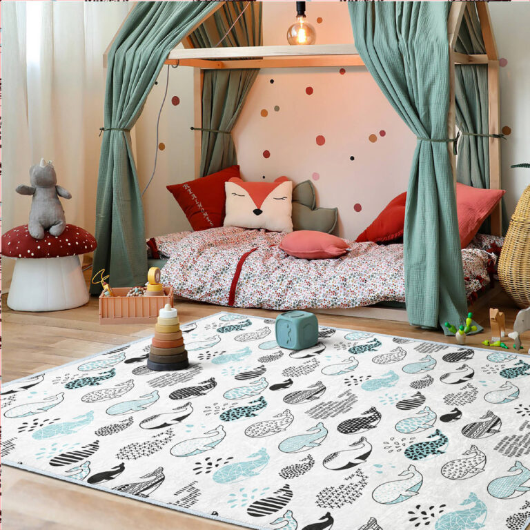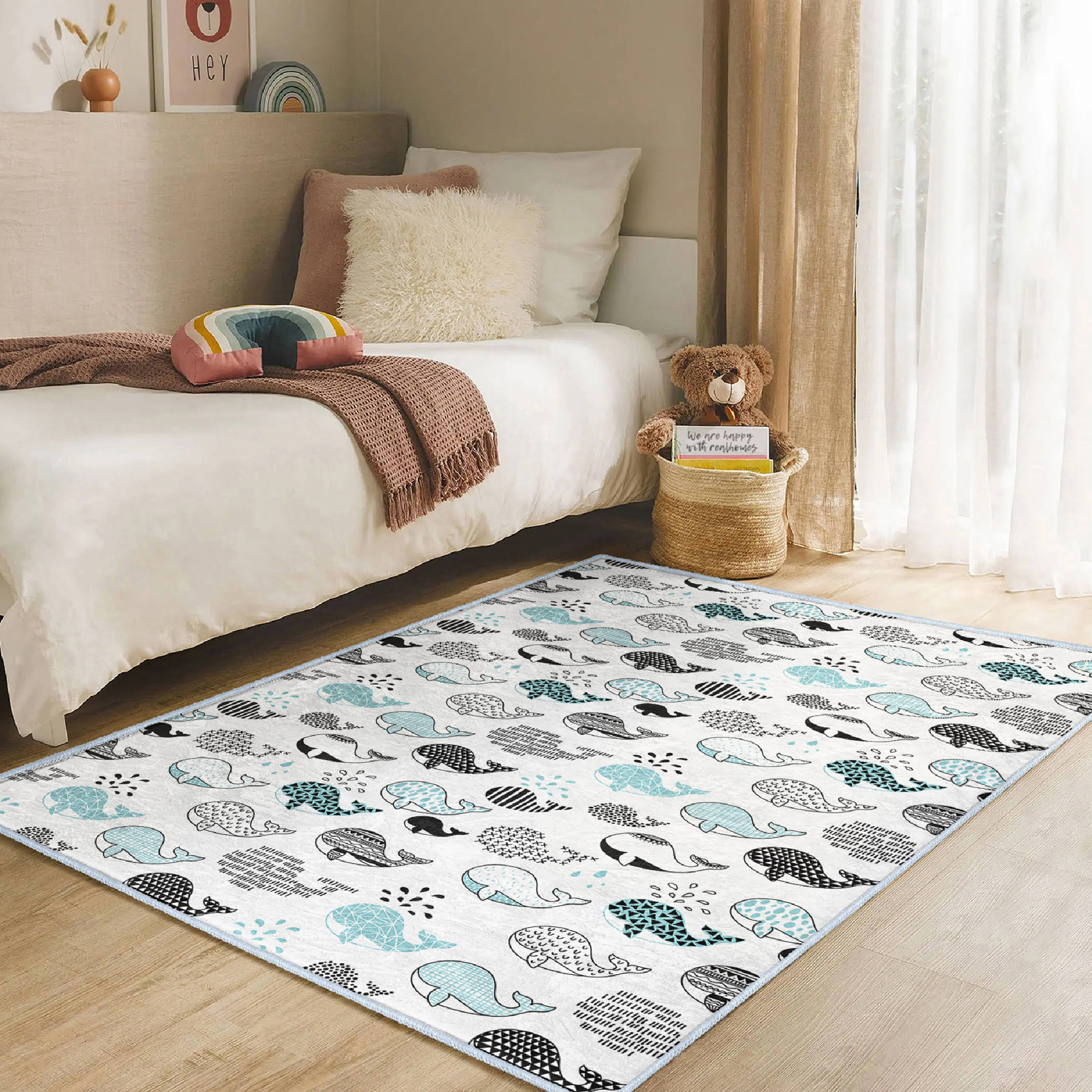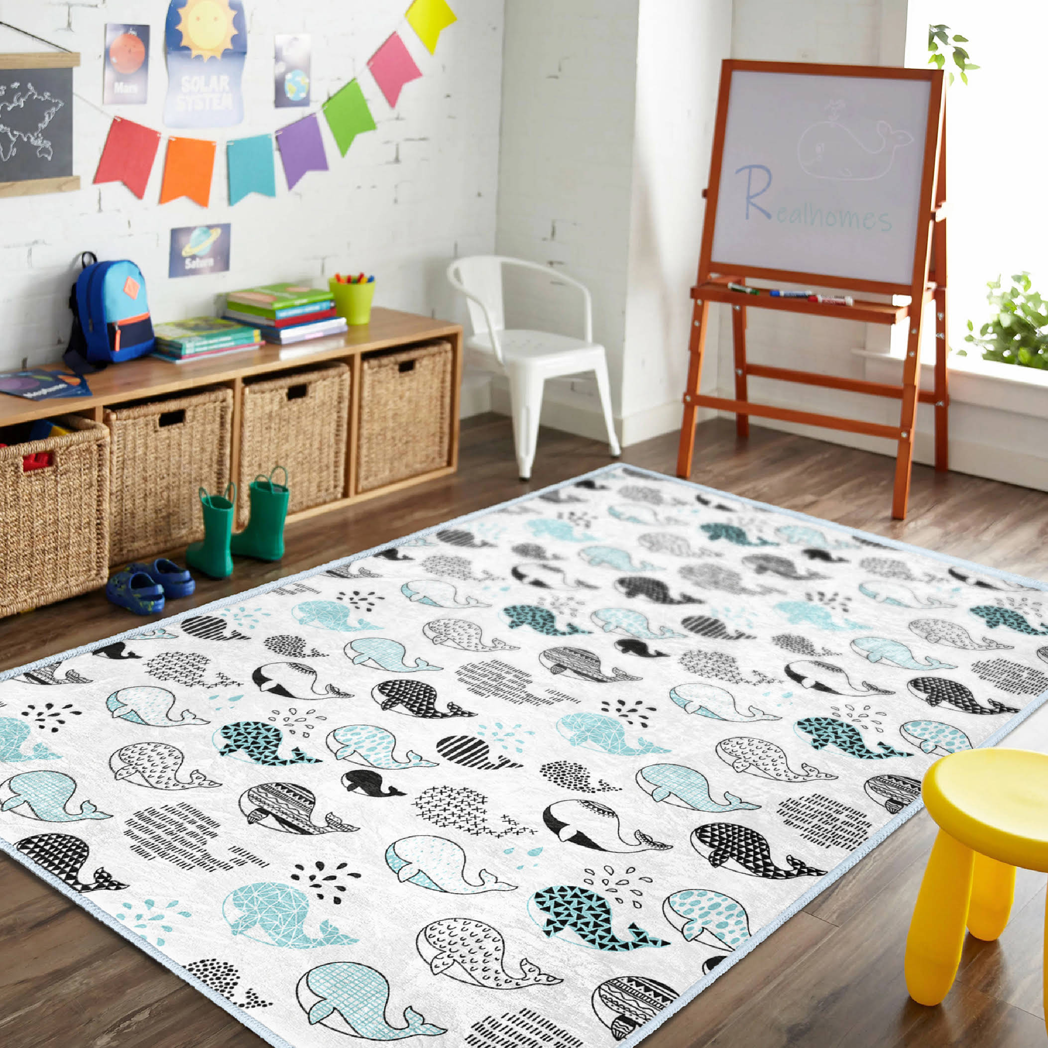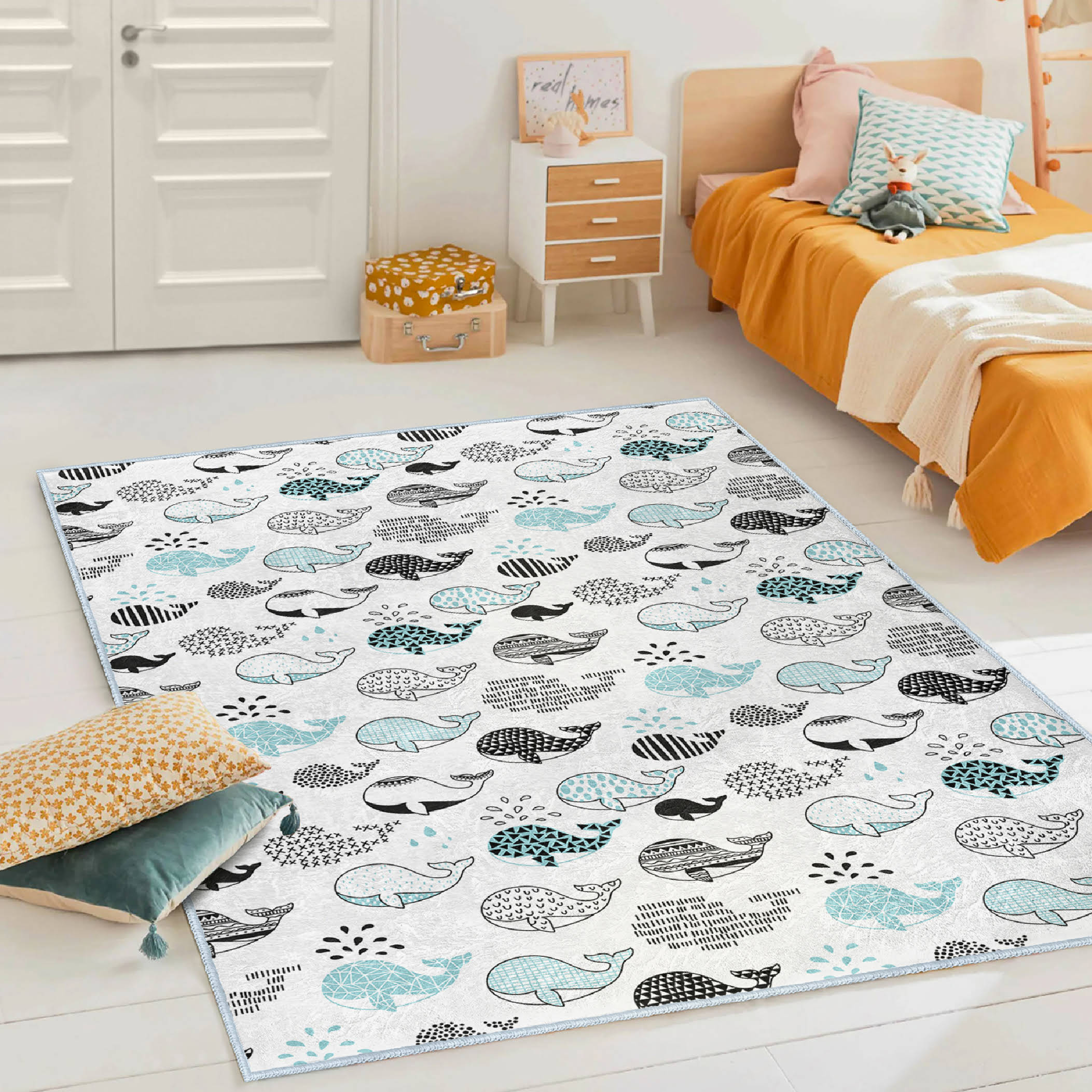 Beyaz Zemin Üzerinde Sevimli Balina Desenli Yıkanabilir Dikdörtgen Çocuk Halısı