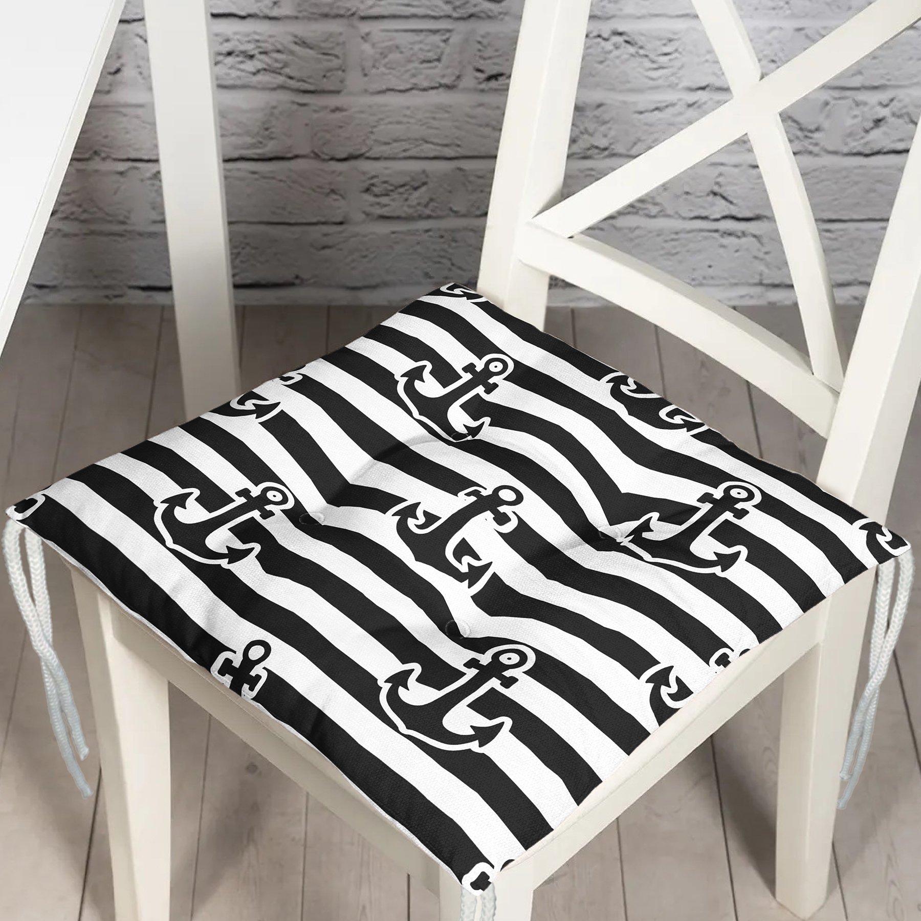 Beyaz Zemin Üzerinde Siyah Çizgili Çapa Desenli Dijital Baskılı Modern Pofidik Sandalye Minderi