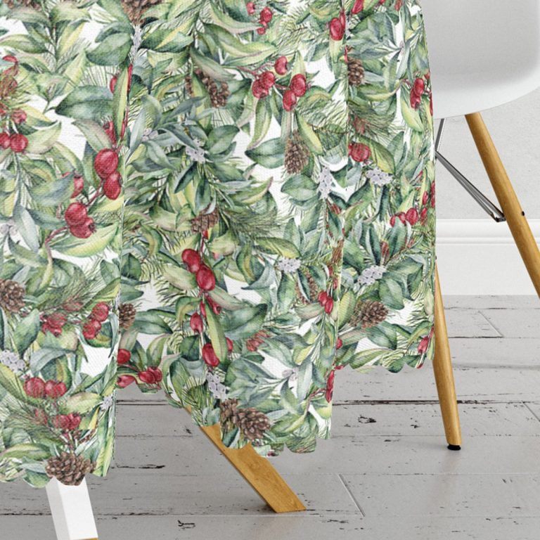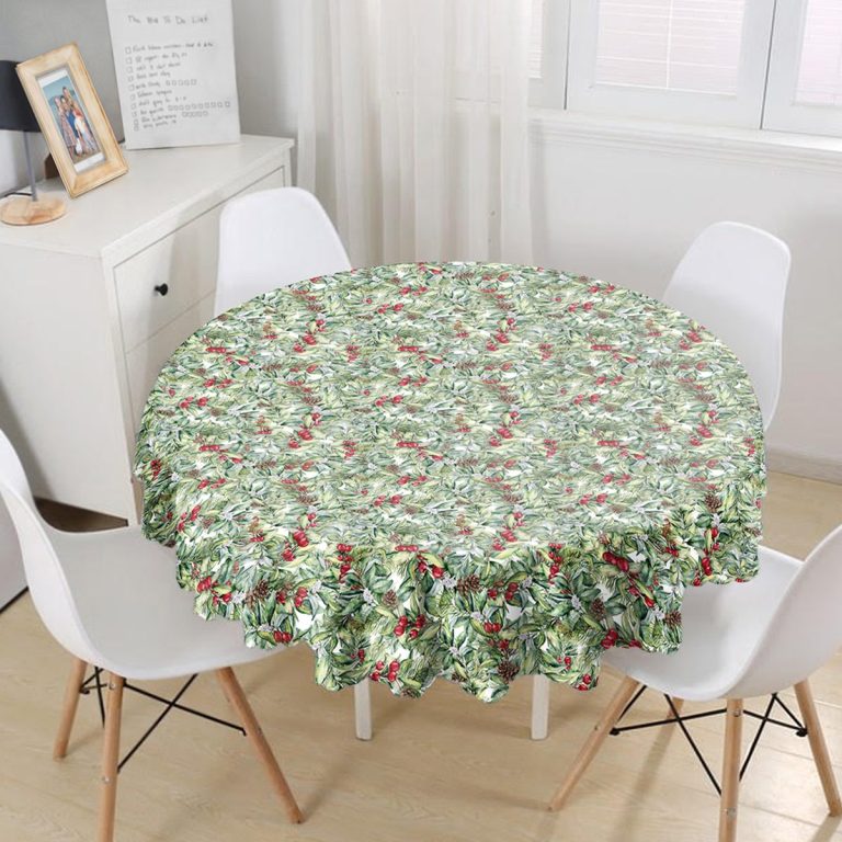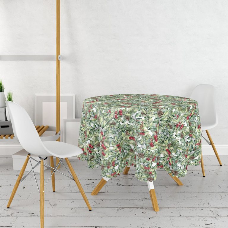 Beyaz Zemin Üzerinde Yaprak Desenli Kiraz Motifli Modern Yuvarlak Masa Örtüsü – Çap 140cm