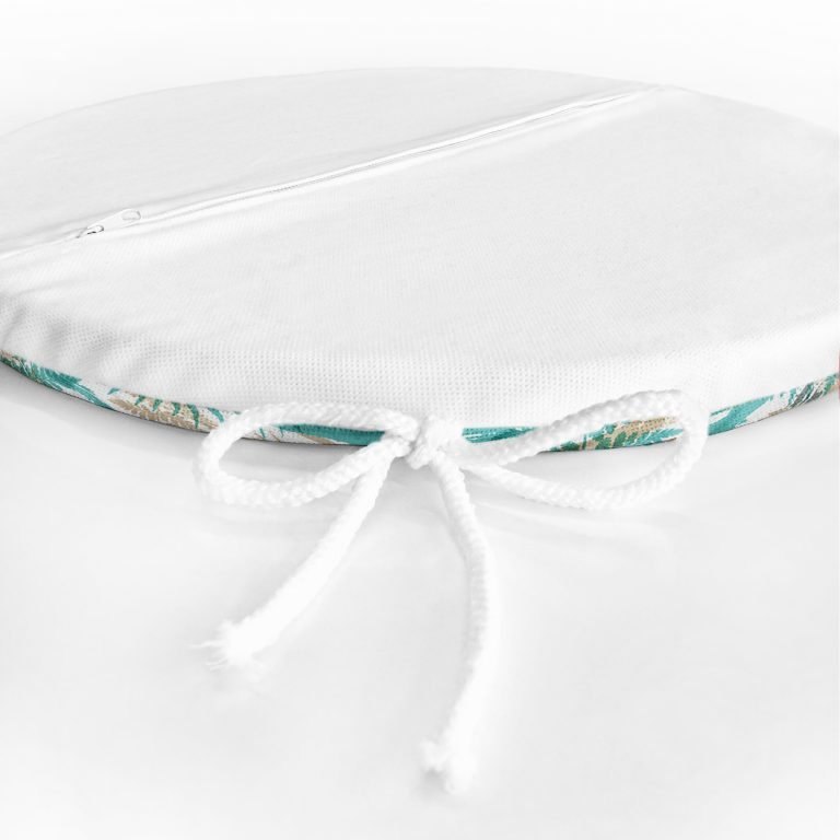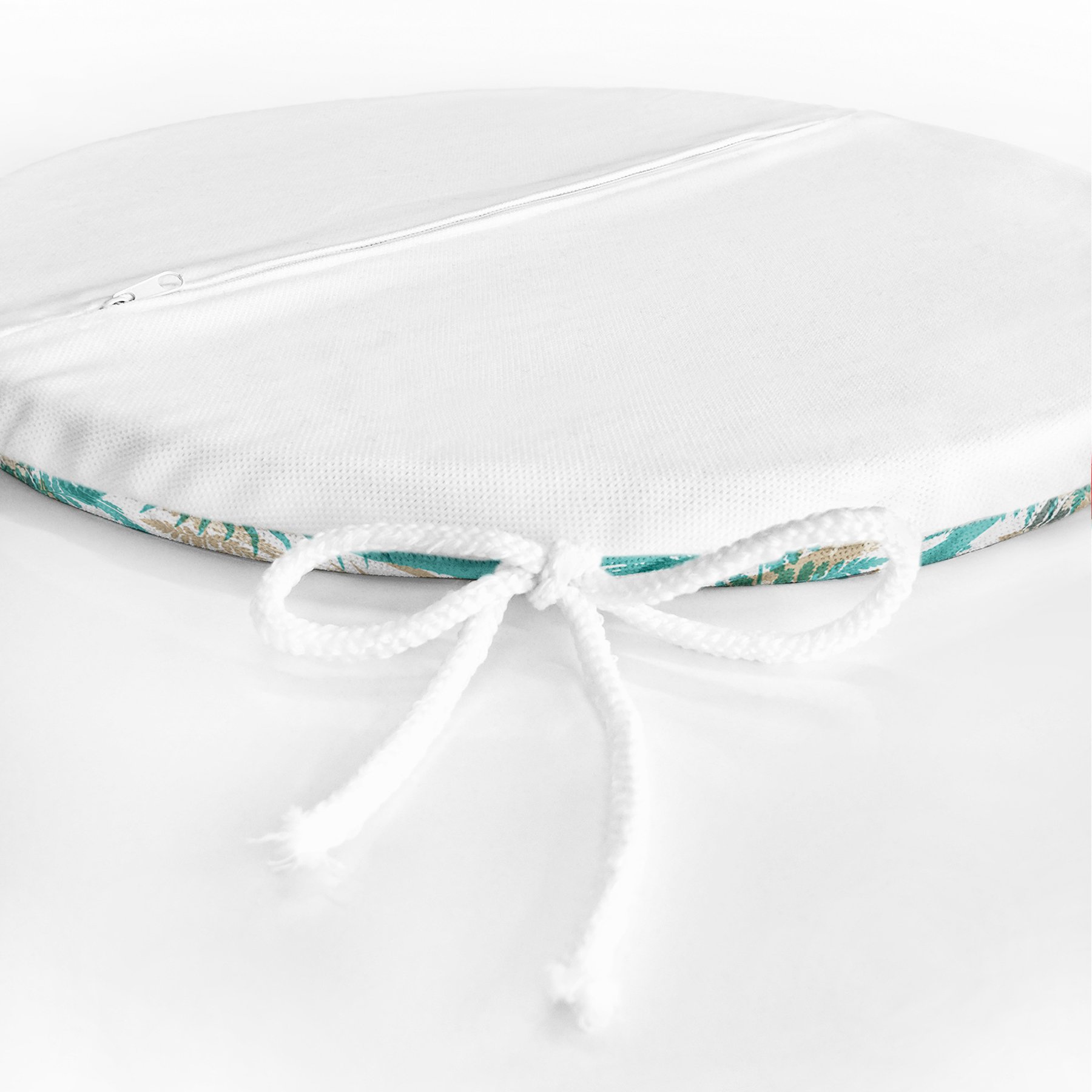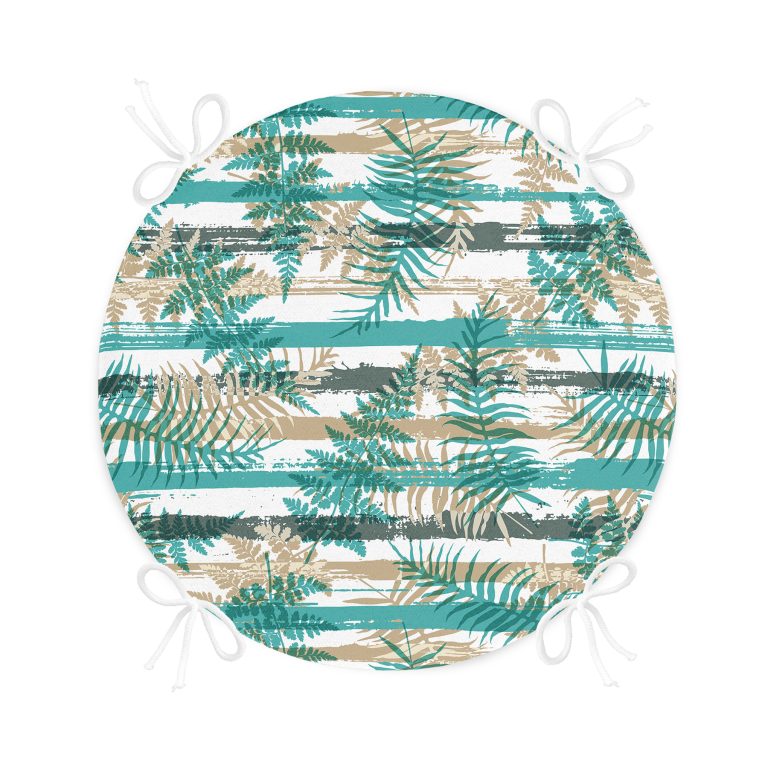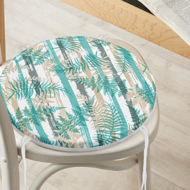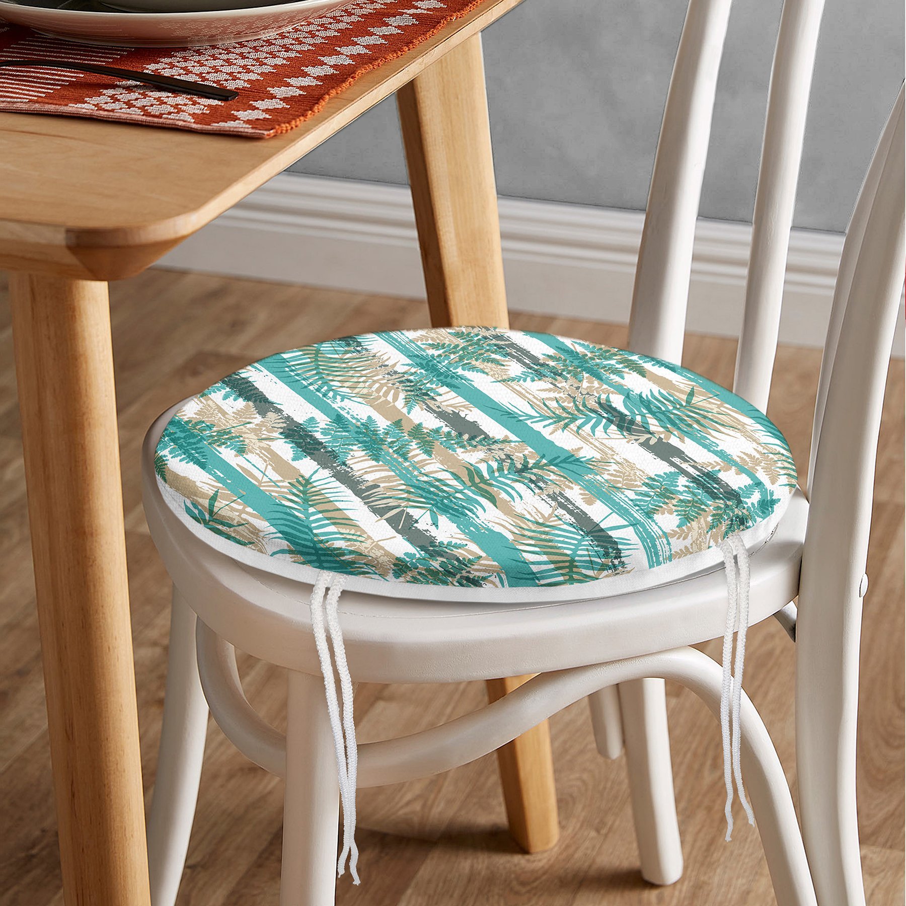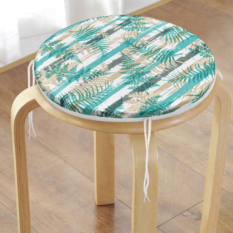 Beyaz Zemin Üzerinde Yeşil Çizgili Yaprak Desenli Dijital Baskılı Modern Yuvarlak Fermuarlı Sandalye Minderi