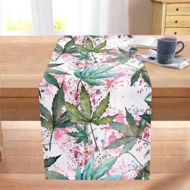 Beyaz Zemin Üzerinde Yeşil Yaprak Desenli Dijital Baskılı Modern Dikişli Şönil Runner