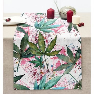 Beyaz Zemin Üzerinde Yeşil Yaprak Desenli Dijital Baskılı Modern Dikişli Şönil Runner