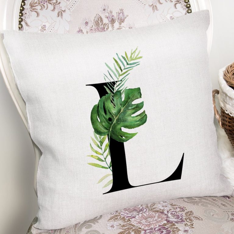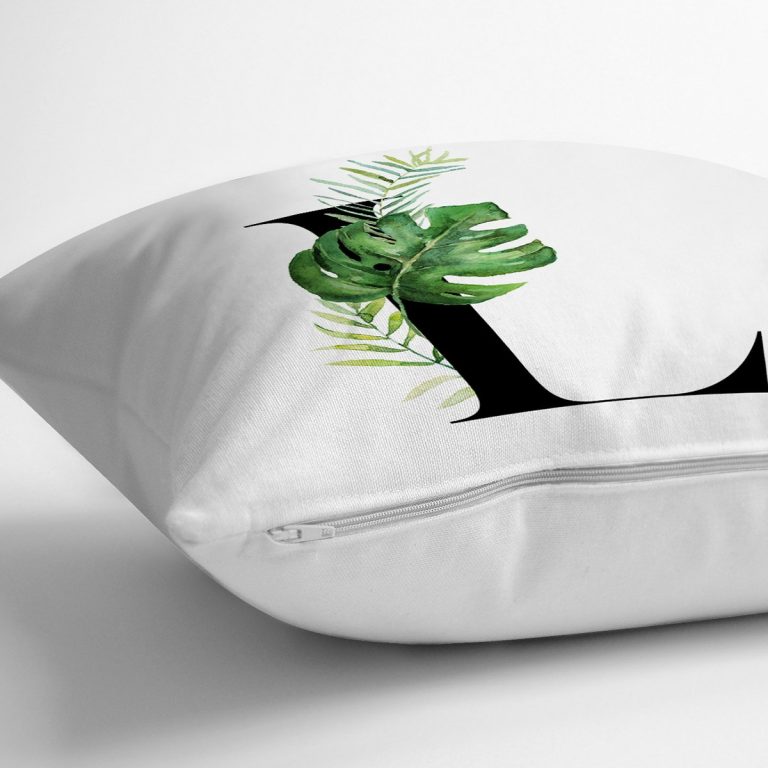 Beyaz Zemin Yaprak Motifli Siyah L Harfi Özel Tasarım Dijital Baskılı Yastık Kırlent Kılıfı