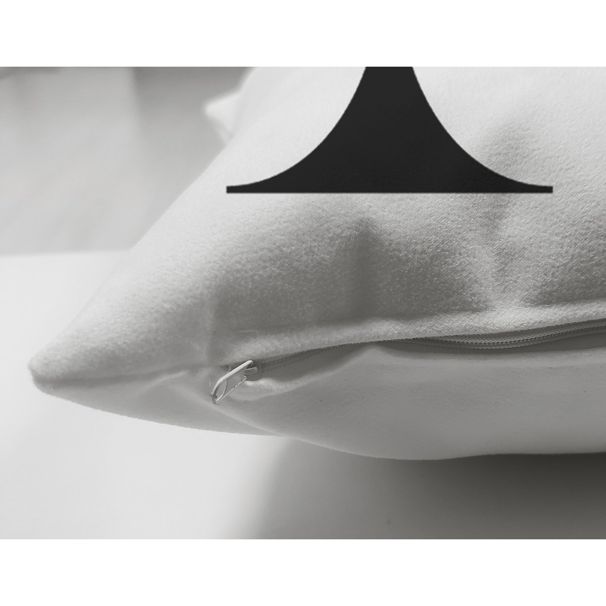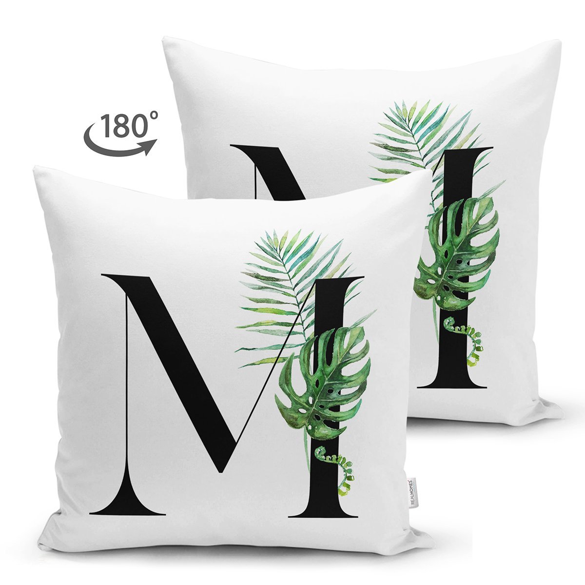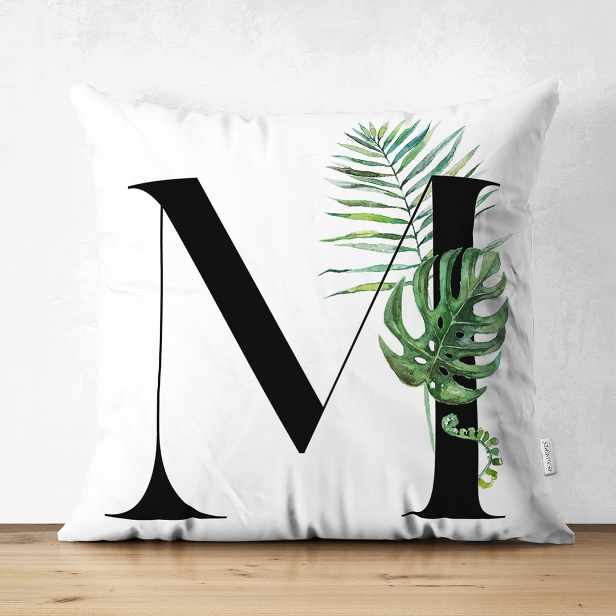 Beyaz Zemin Yaprak Motifli Siyah M Harfi Özel Tasarım Modern Suet Yastık Kırlent Kılıfı