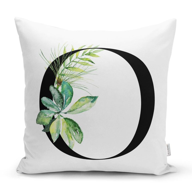 Beyaz Zemin Yaprak Motifli Siyah O Harfi Özel Tasarım Dijital Baskılı Yastık Kırlent Kılıfı