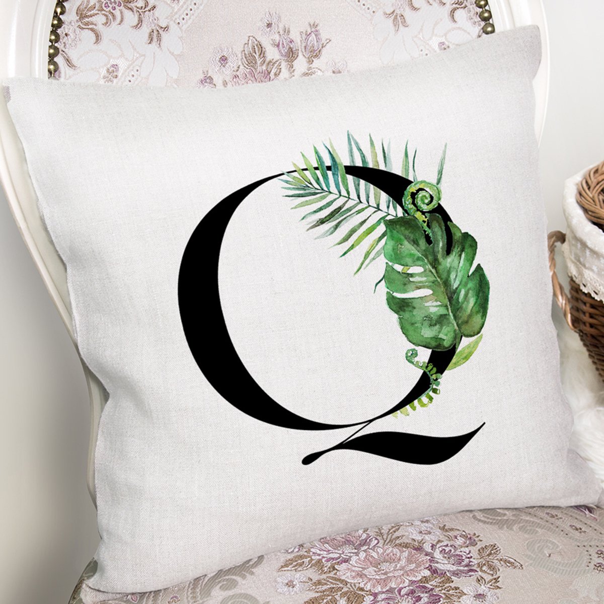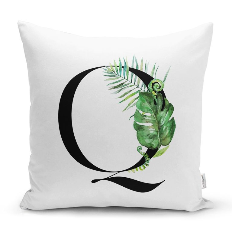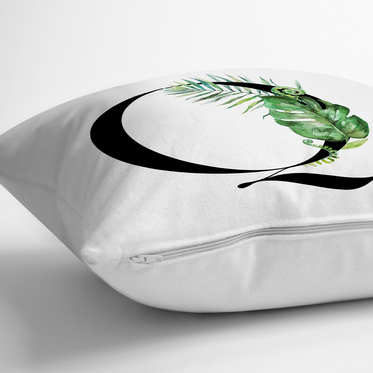 Beyaz Zemin Yaprak Motifli Siyah Q Harfi Özel Tasarım Dijital Baskılı Yastık Kırlent Kılıfı