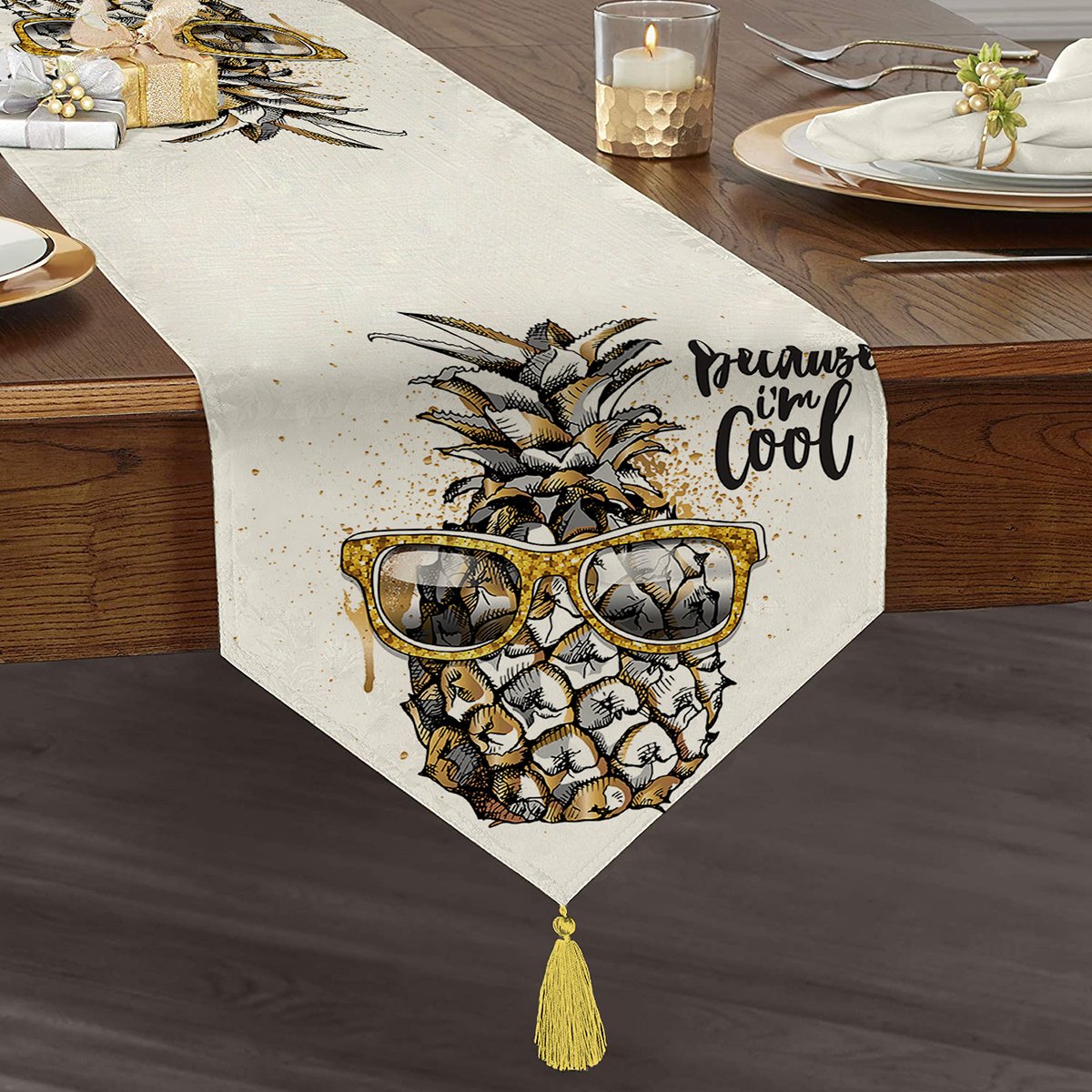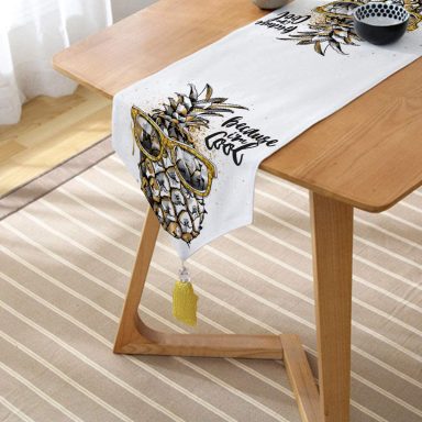 Beyaz Zeminde 3D Ananas Özel Tasarımlı Püsküllü Şönil Üçgen Runner