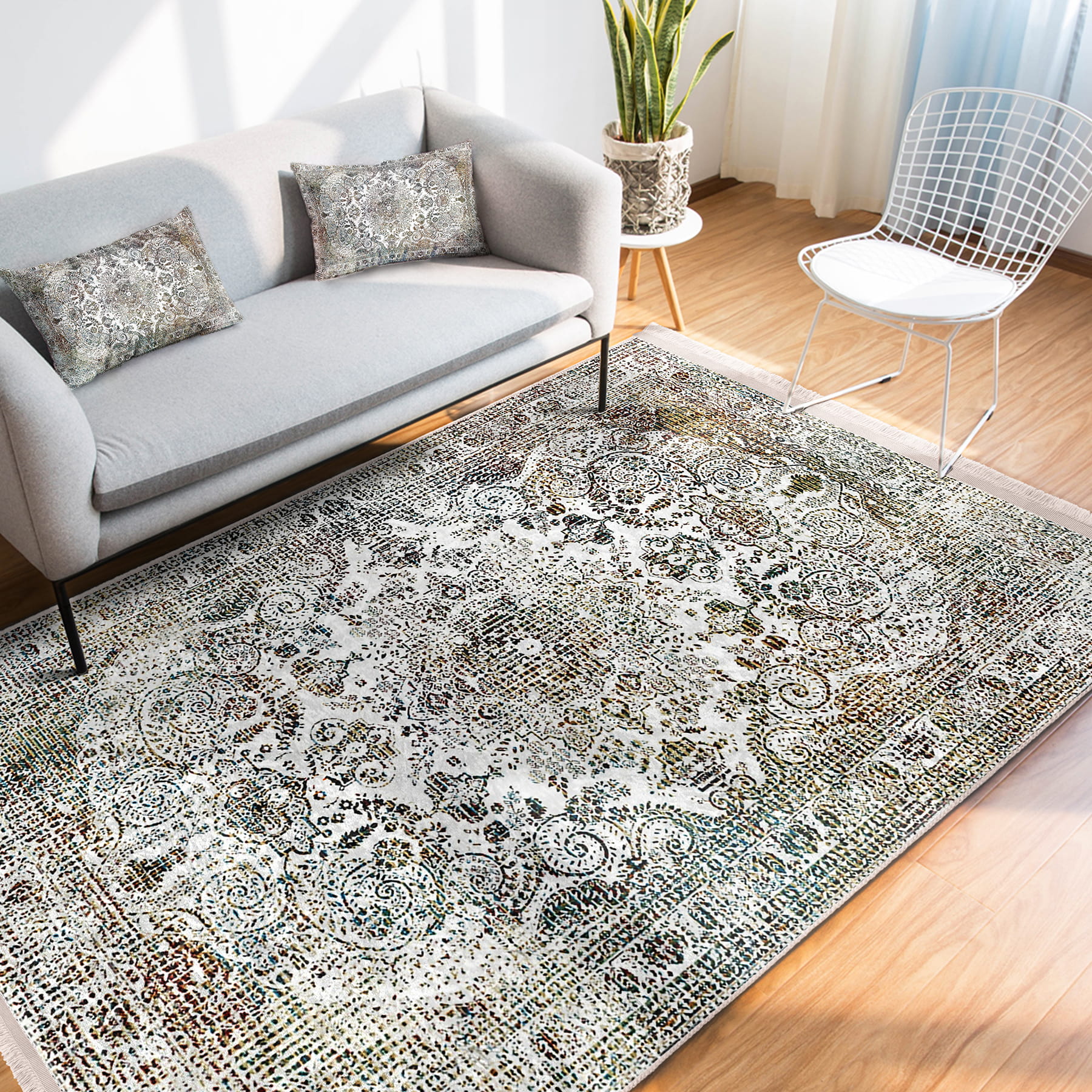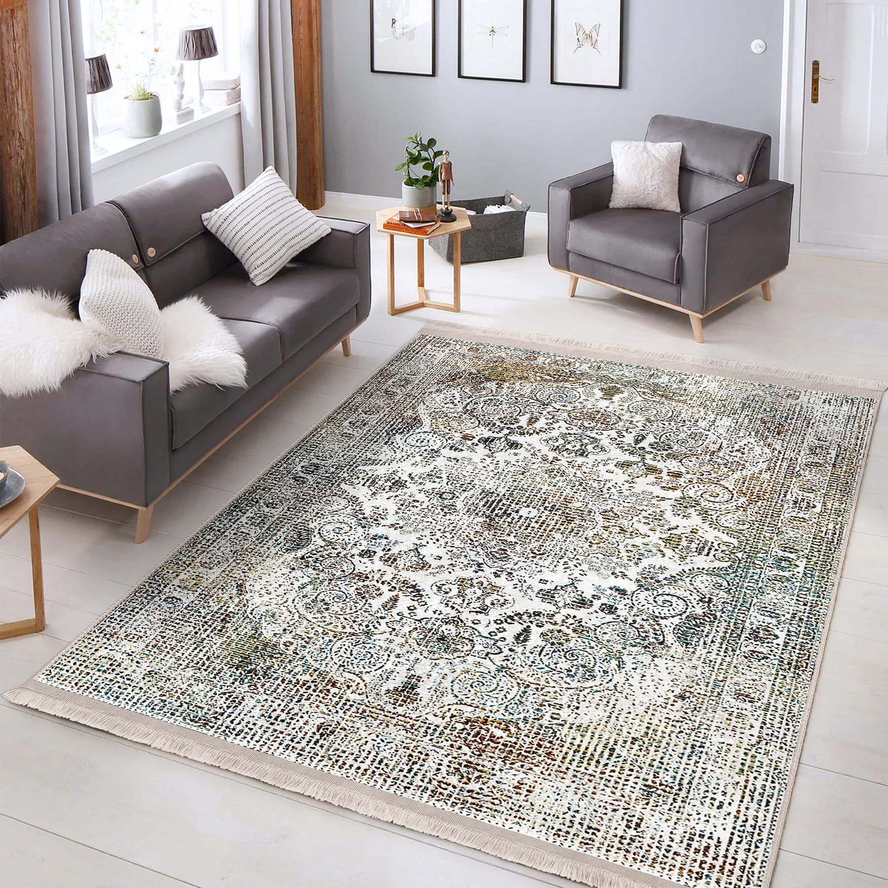 Beyaz Zeminde Antik Motifli Göbekli Halı Desenli Avangarde Etnik Motifler Yatak Odası Salon & Oturma Odası Dijital Baskılı Makinede Yıkanabilir Kaymaz Taban Saçaklı Halı