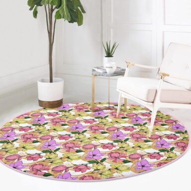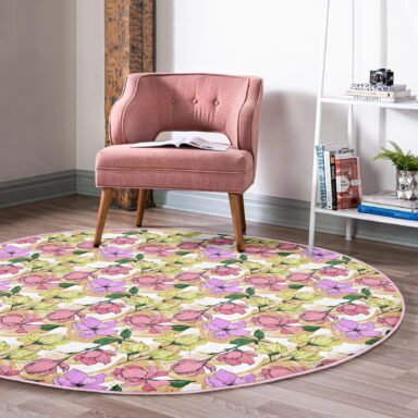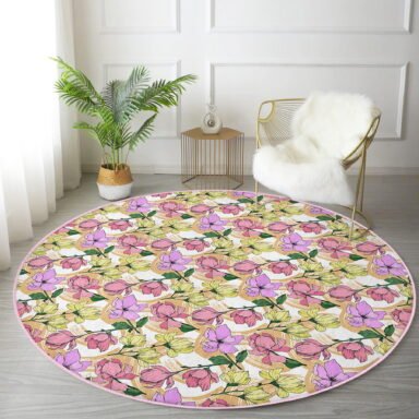 Beyaz Zeminde Çiçek Desenli Modern Pembe Yatak Odası Yıkanabilir Kaymaz Tabanlı Yuvarlak Halı