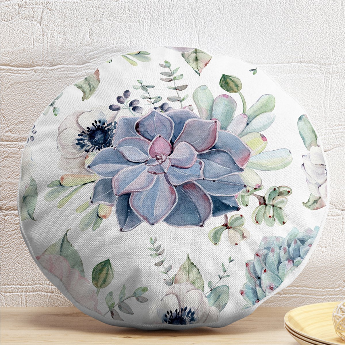 Beyaz Zeminde Çiçek Motifli Dijital Baskılı Dekoratif Yuvarlak Yastık Kırlent Kılıfı