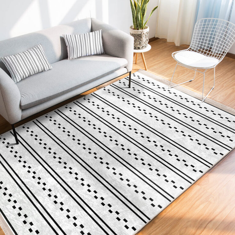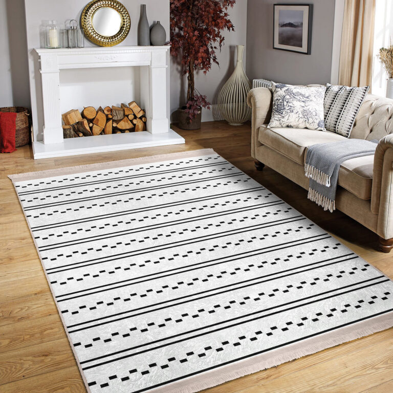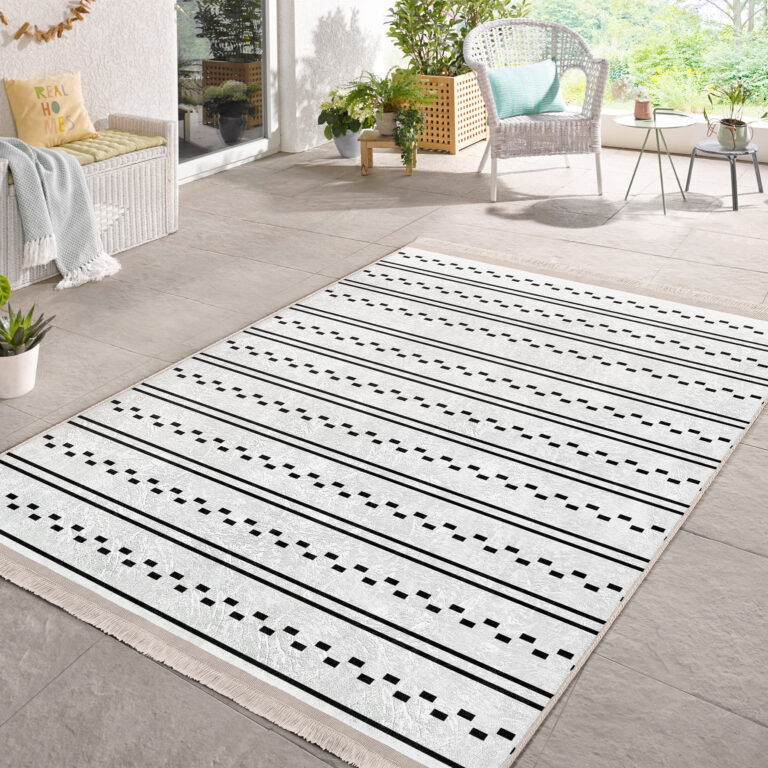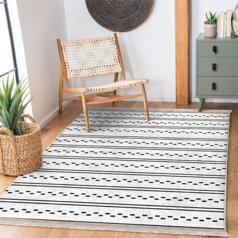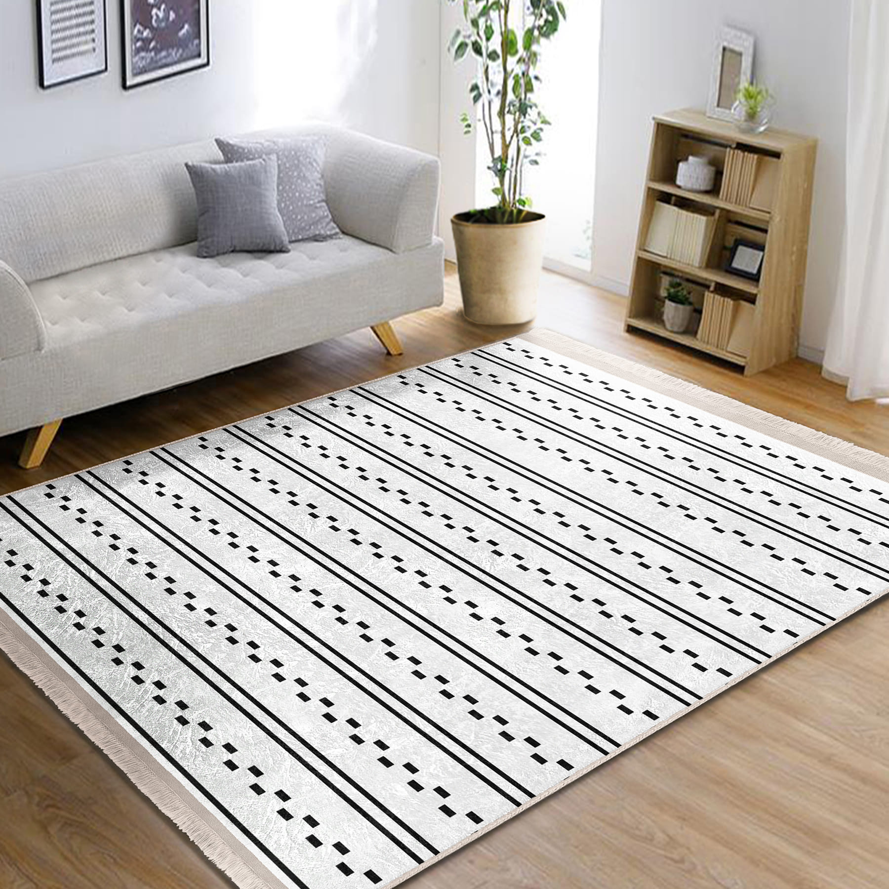 Beyaz Zeminde Çizgili Motifli İskandinav Desenli Sade & Şık Geometrik Koridor & Antre Salon & Oturma Odası Dijital Baskılı Makinede Yıkanabilir Kaymaz Taban Saçaklı Halı
