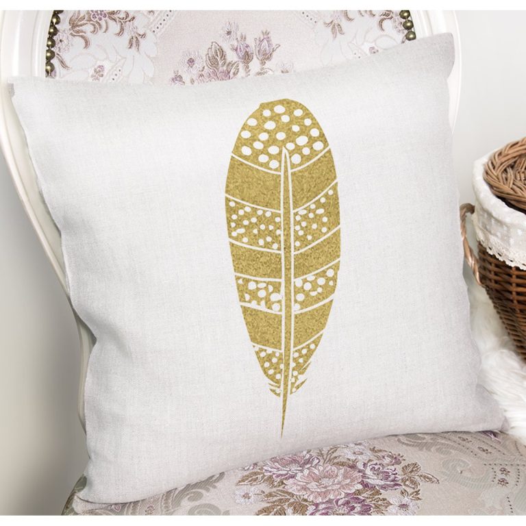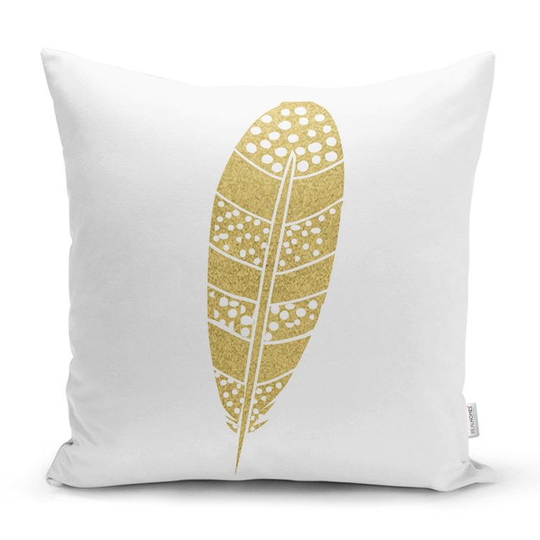 Beyaz Zeminde Gold Kuş Tüyü Desenli Dijital Baskılı Modern Yastık Kırlent Kılıfı