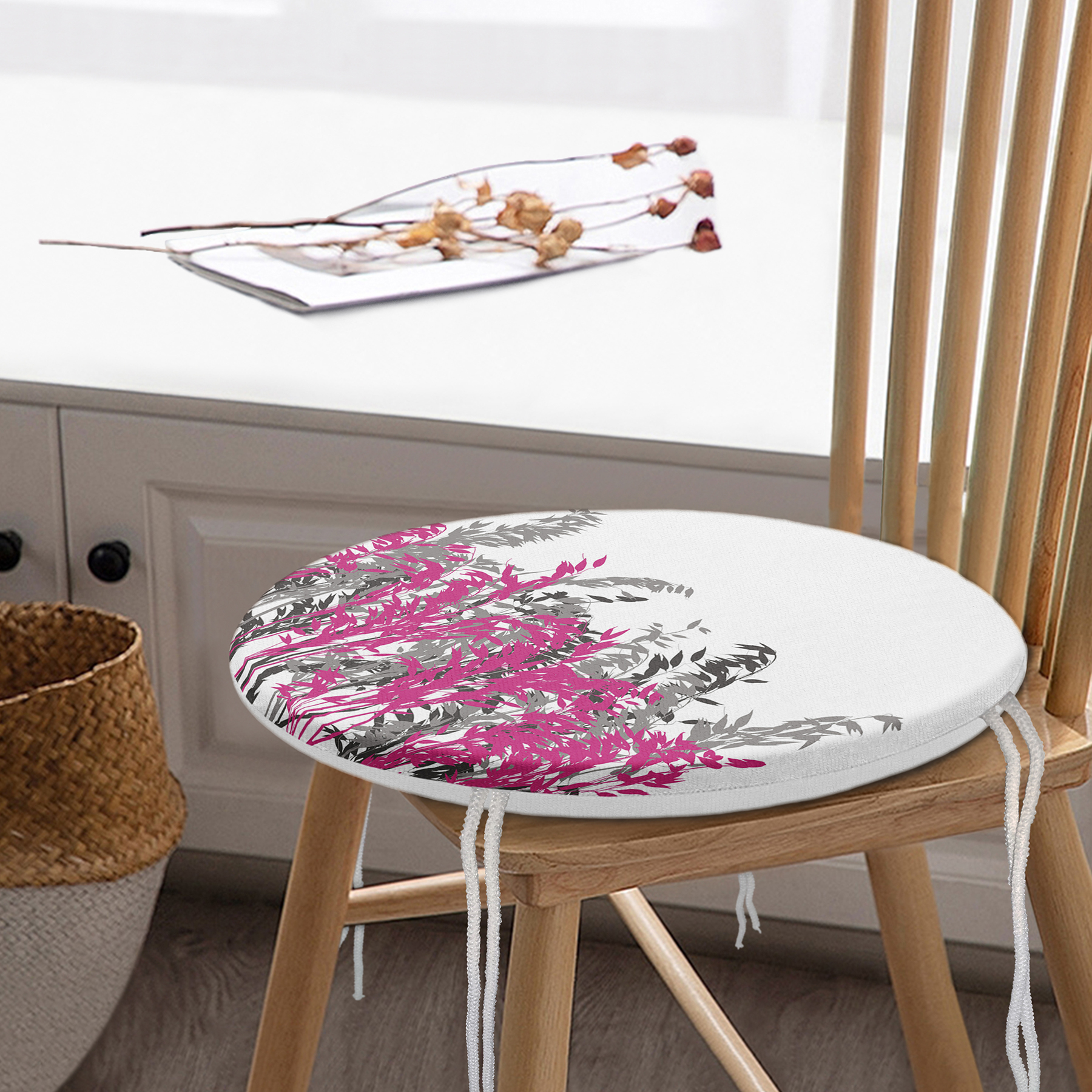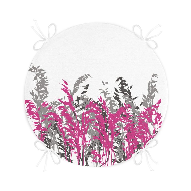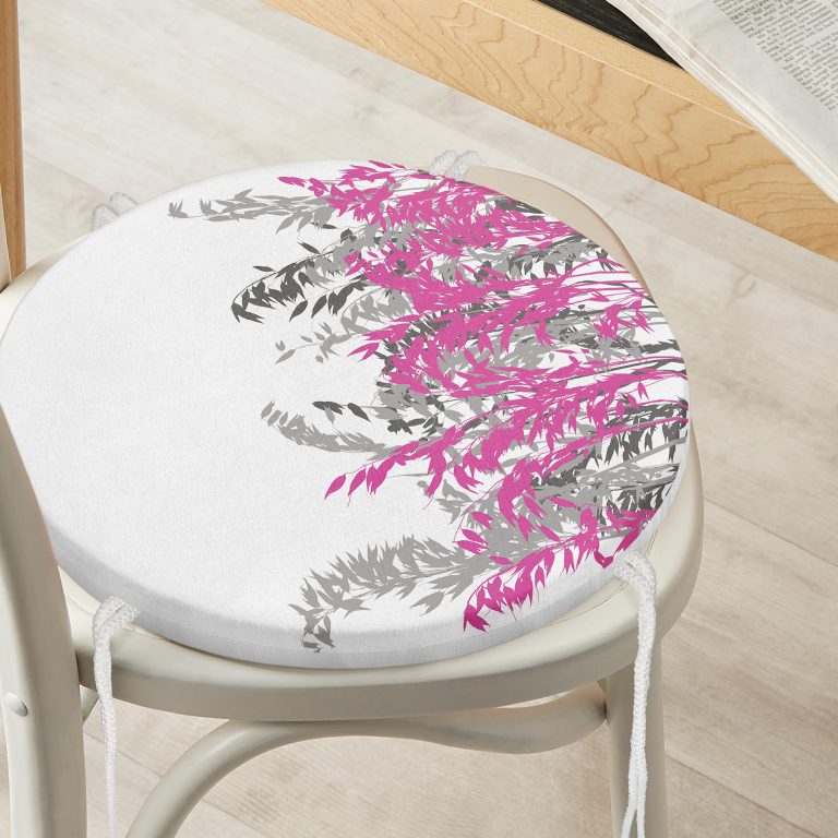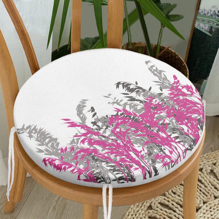 Beyaz Zeminde Gri Ve Fuşya Çiçek Dijital Baskılı Yuvarlak Fermuarlı Sandalye Minderi