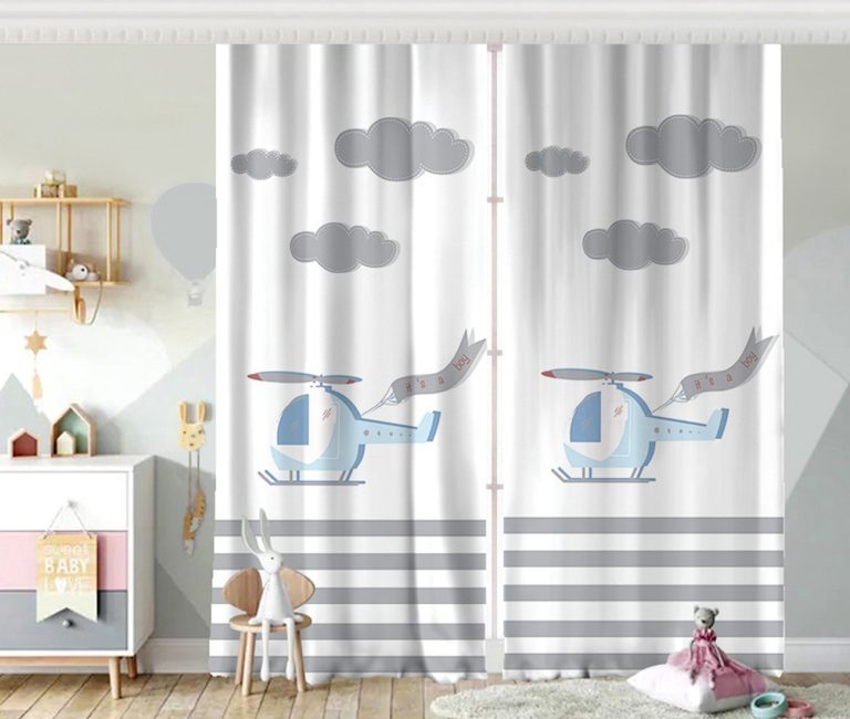 Beyaz Zeminde Helikopter Tasarımlı Bebek Odası Fon Perde