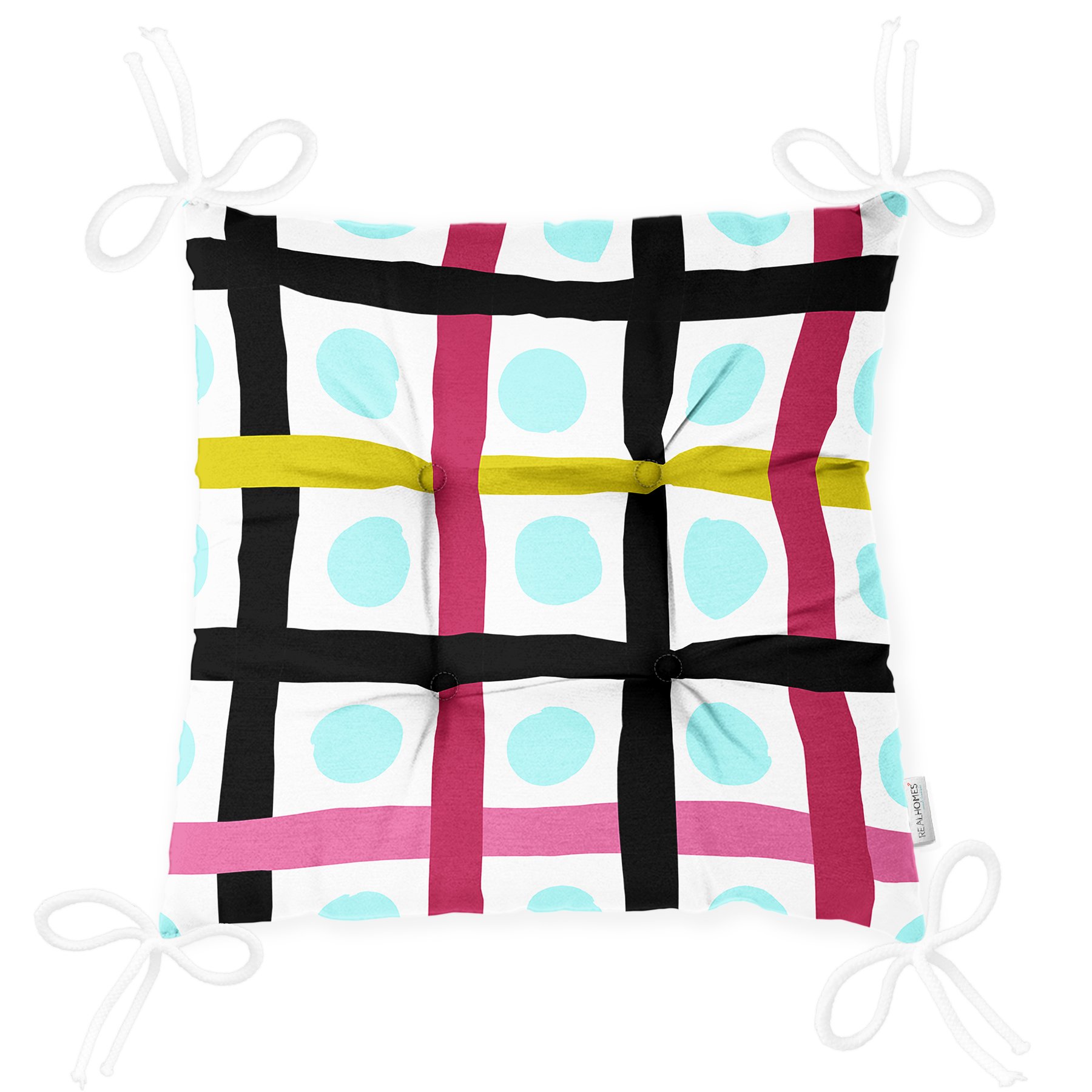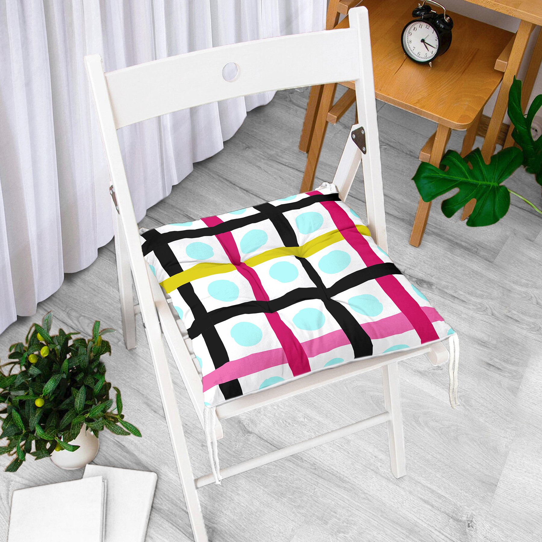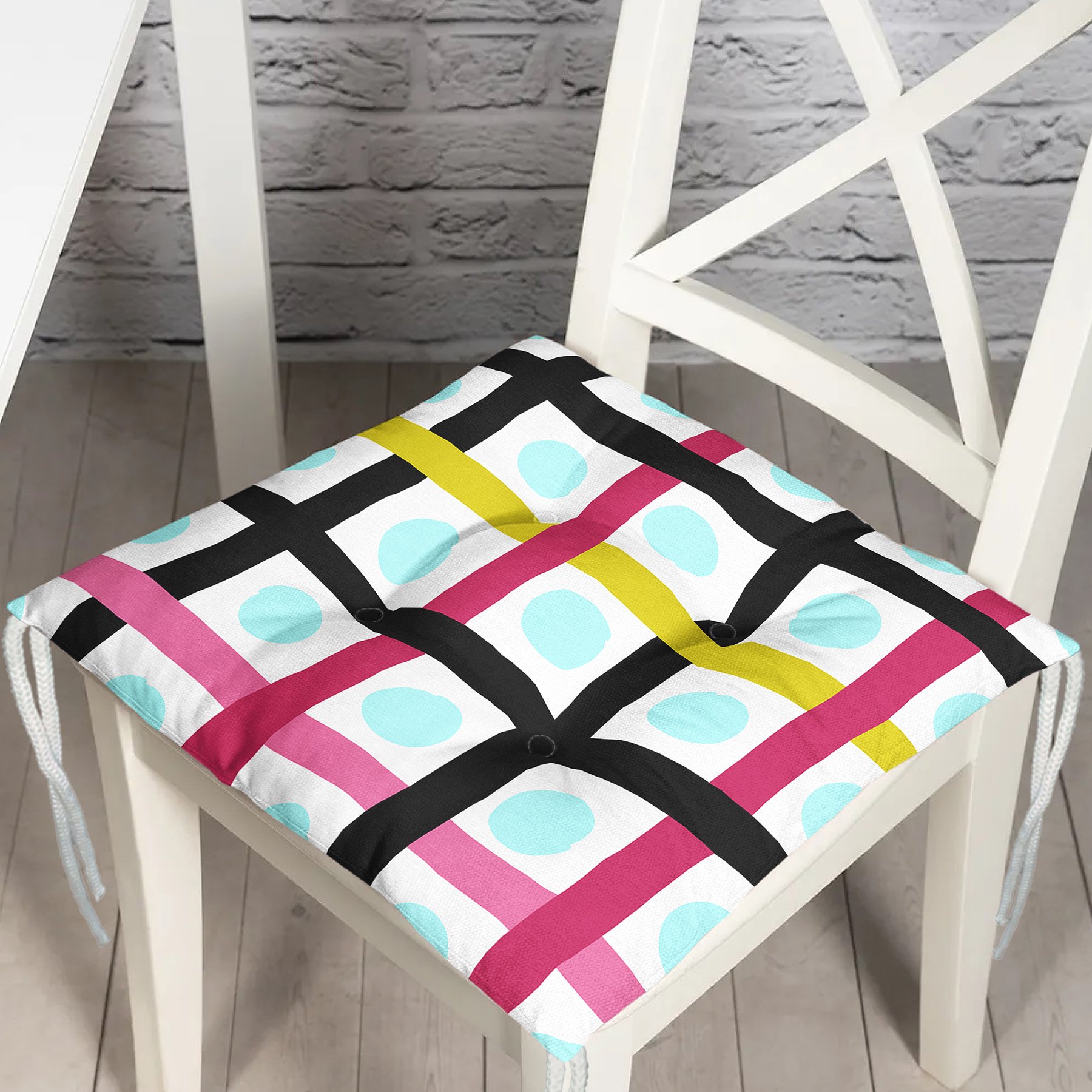 Beyaz Zeminde Modern Renkli Çizgili Puantiye Desenli Dijital Baskılı Modern Pofidik Sandalye Minderi