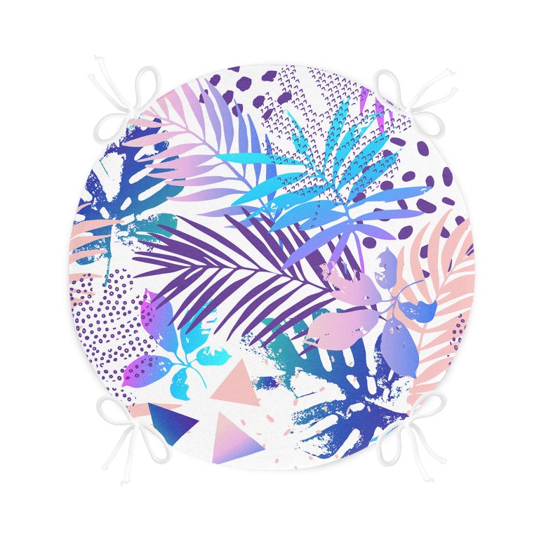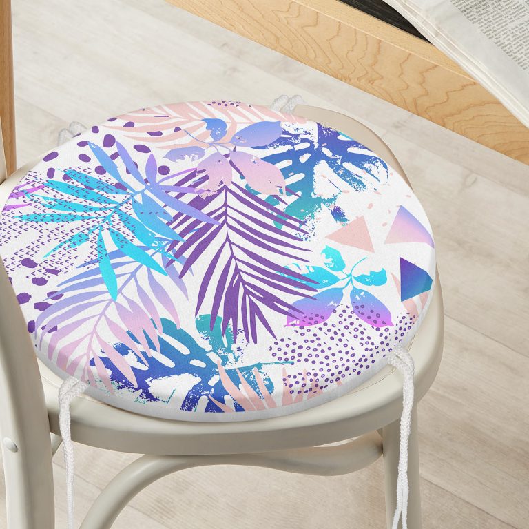 Beyaz Zeminde Renkli Ananas Yaprakları Desenli Dijital Baskılı Yuvarlak Fermuarlı Sandalye Minderi
