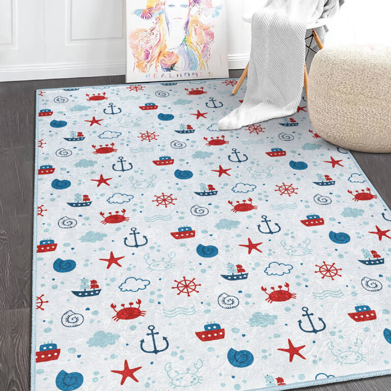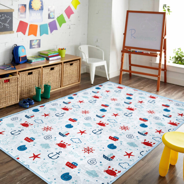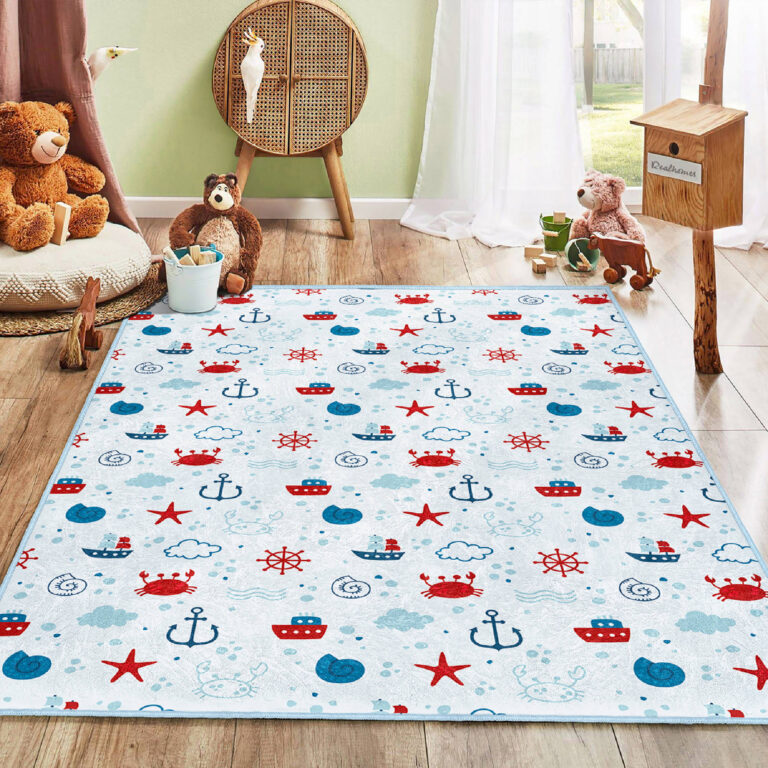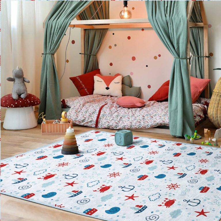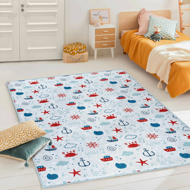 Beyaz Zeminde Renkli Deniz Temalı Çocuk Halısı – Eğlenceli Deniz Hayvanları & Gemi Motifleri
