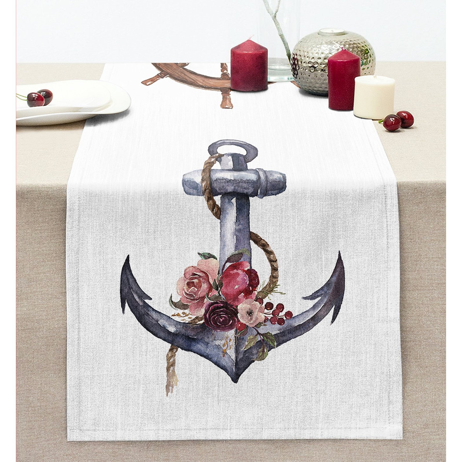 Beyaz Zeminde Sade Çapa Tasarımlı Dijital Baskılı Dekoratif Dikişli Şönil Runner