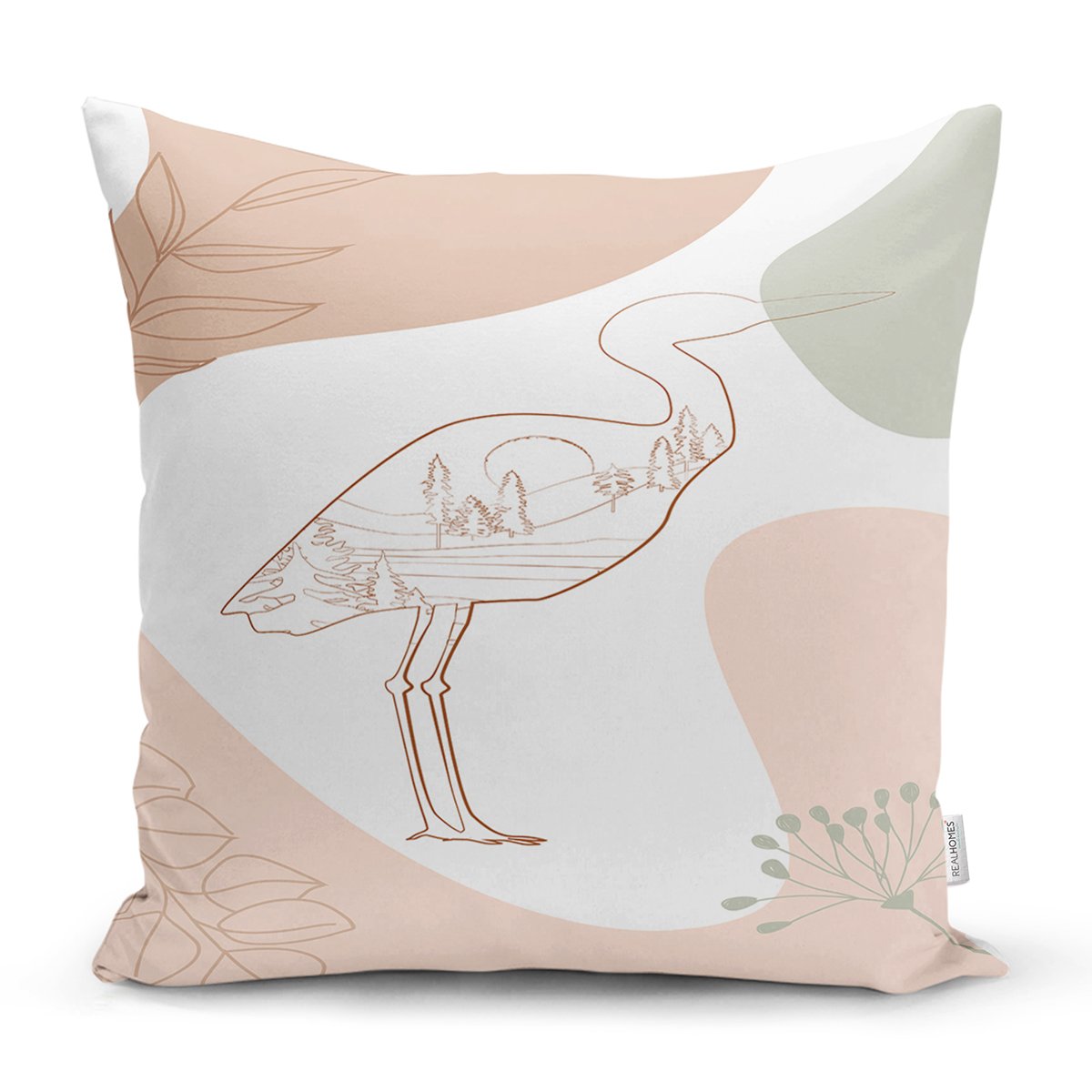 Beyaz Zeminde Soft Renkli Leylek Motifli Dijital Baskılı Modern Kırlent Kılıfı