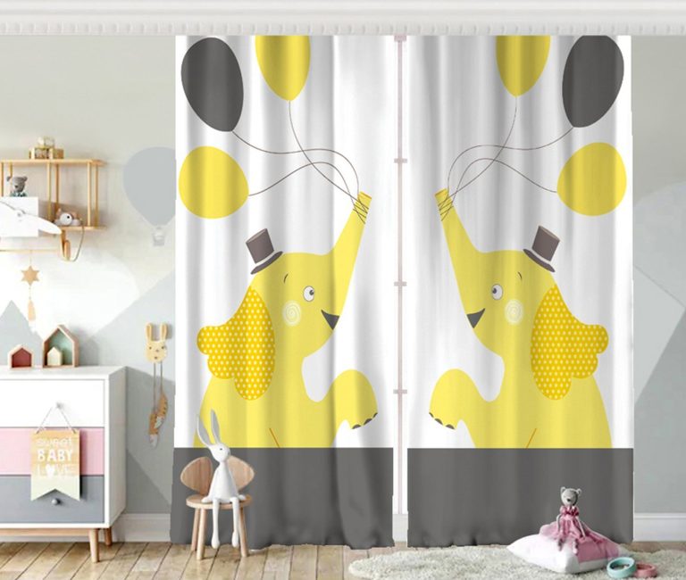 Beyaz Zeminde Uçan Balonlar ve Fil Desenli Çocuk Odası Fon Perde