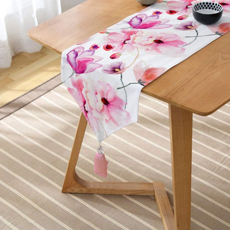 Beyaz Zeminli Çiçek Temalı Dijital Baskılı Modern Püsküllü Şönil Üçgen Runner